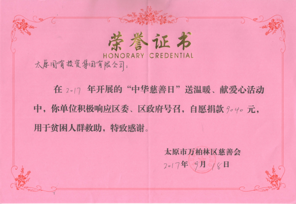 樂(lè)善好施、扶貧幫困是中華民族的傳統(tǒng)美德;奉獻(xiàn)社會(huì)、傳遞愛(ài)心是社會(huì)倡導(dǎo)的時(shí)代新風(fēng)。為培育和弘揚(yáng)社會(huì)主義核心價(jià)值觀,廣泛動(dòng)員員工參與慈善、奉獻(xiàn)愛(ài)心,形成團(tuán)結(jié)互助、扶貧濟(jì)困的良好風(fēng)尚,積極參與公民道德宣傳日活動(dòng)。9月14日,太原國(guó)投集團(tuán)組織開(kāi)展了“中華慈善日”送溫暖、獻(xiàn)愛(ài)心捐款活動(dòng),共募集善款9040元整。