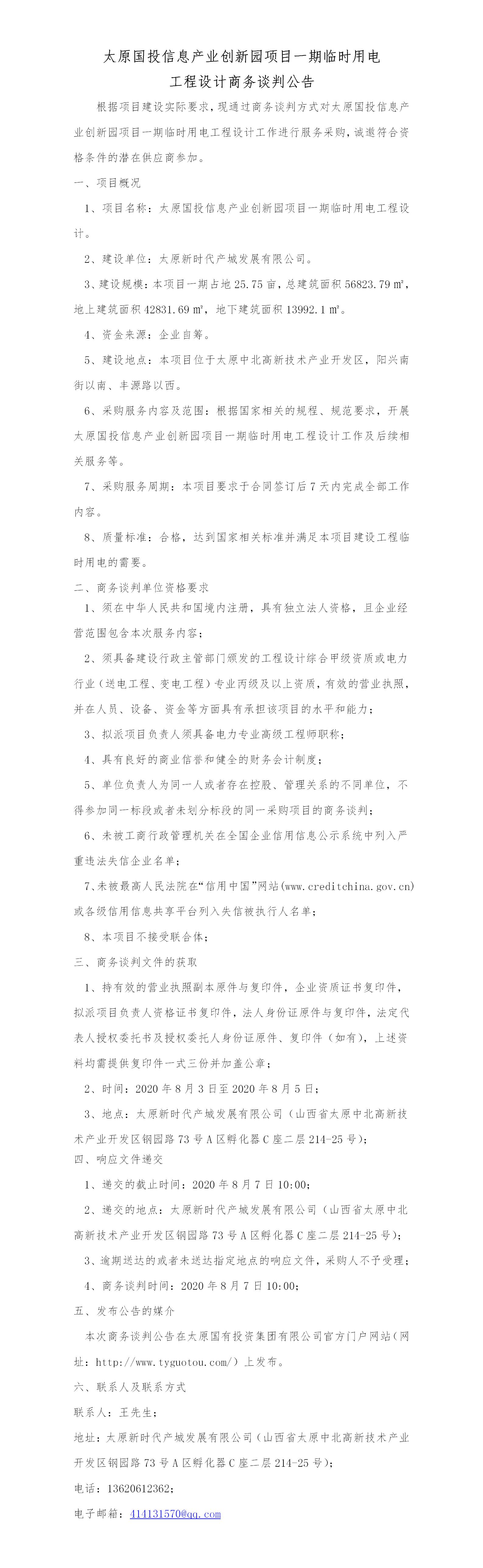太原國(guó)投信息產(chǎn)業(yè)創(chuàng)新園項(xiàng)目一期臨時(shí)用電工程設(shè)計(jì)商務(wù)談判公告