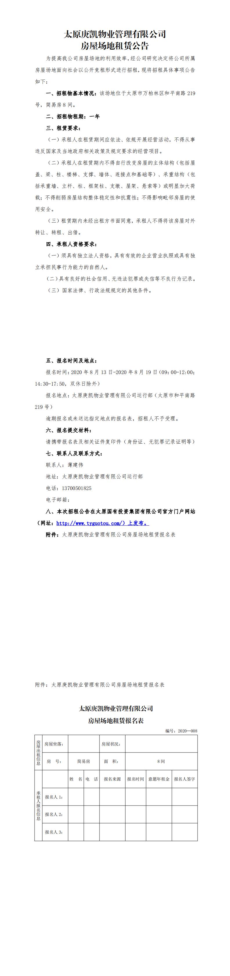 太原庚凱物業(yè)管理有限公司房屋場地租賃公告(八)