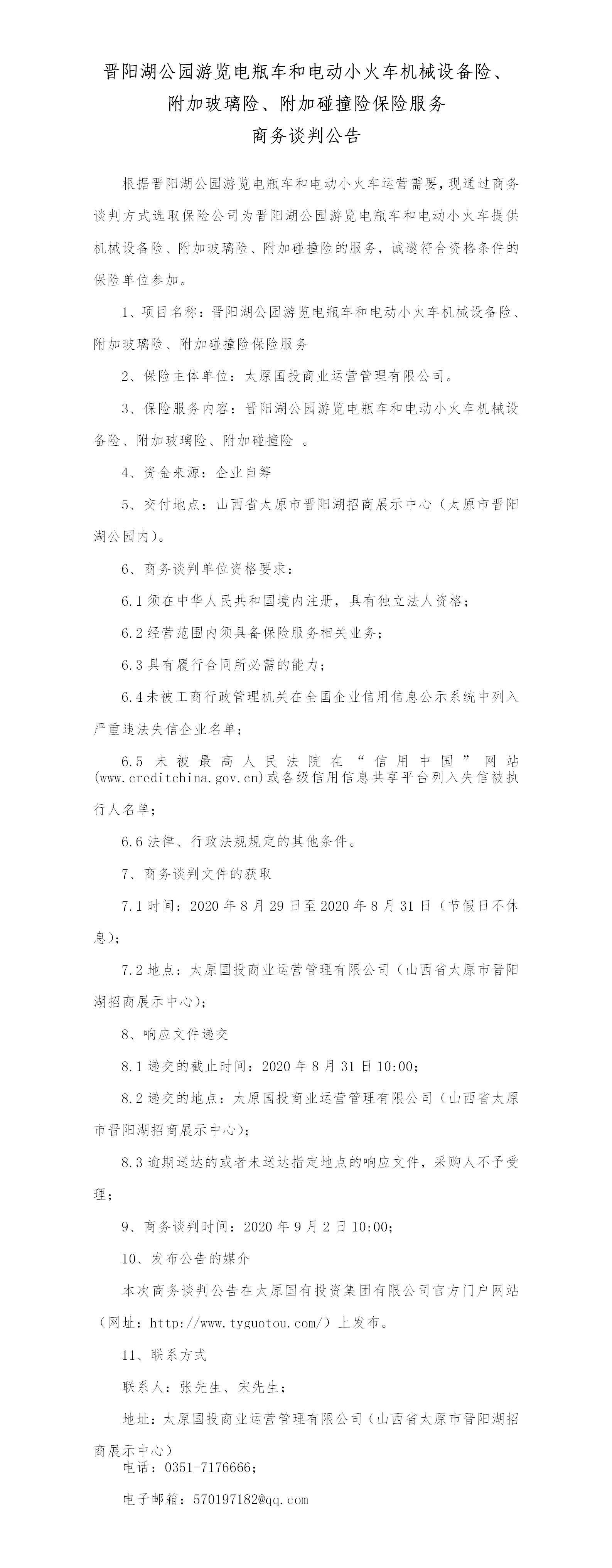 晉陽湖公園游覽電瓶車和電動小火車機械設備險、附加玻璃險、附加碰撞險保險服務商務談判公告