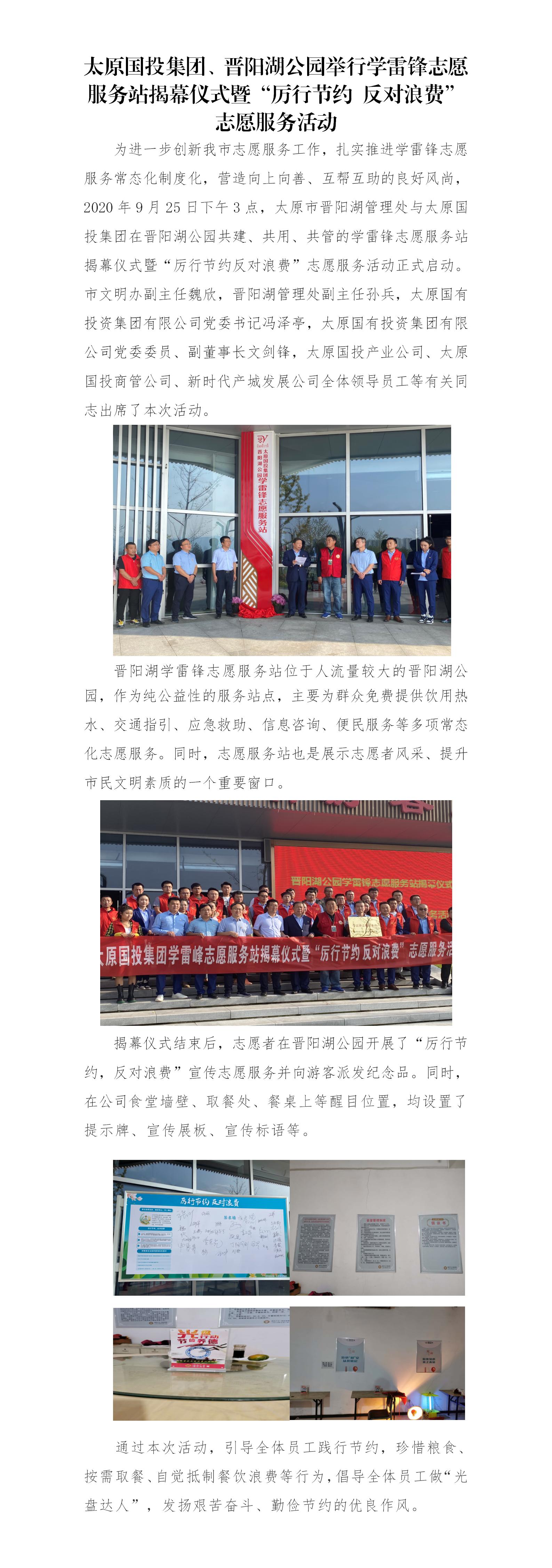 太原國(guó)投集團(tuán)、晉陽(yáng)湖公園舉行學(xué)雷鋒志愿服務(wù)站揭幕儀式暨“厲行節(jié)約 反對(duì)浪費(fèi)”志愿服務(wù)活動(dòng)
