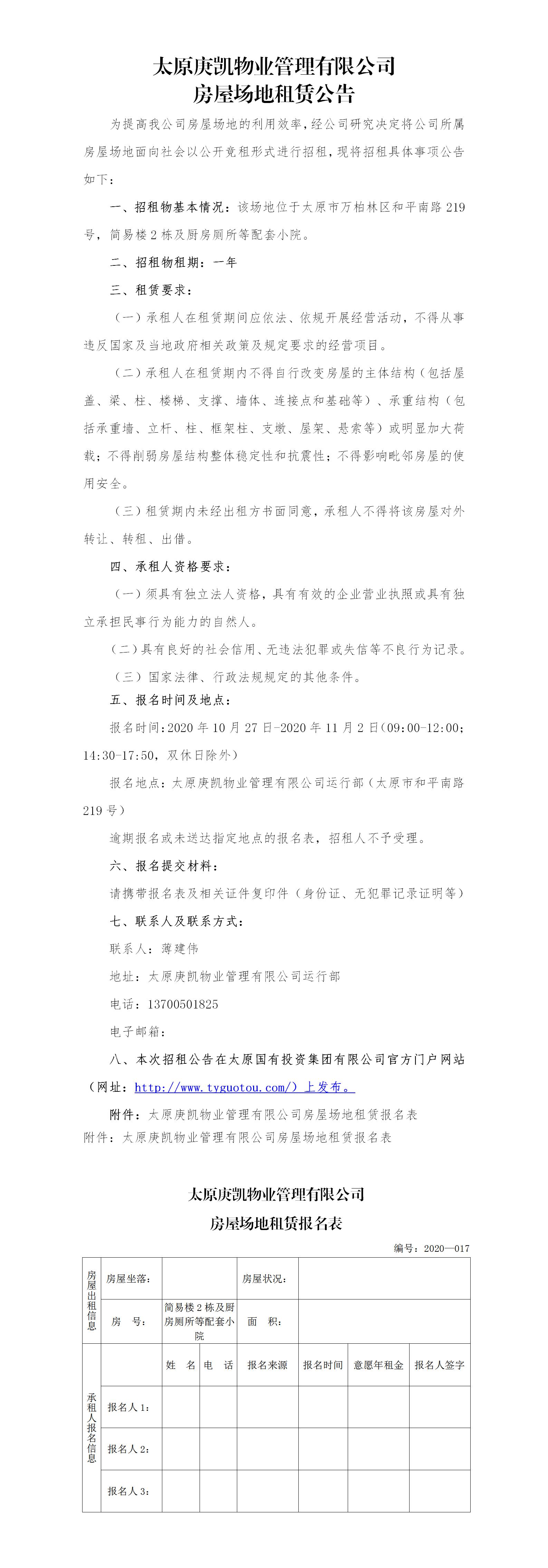 太原庚凱物業(yè)管理有限公司房屋場地租賃公告(十七)