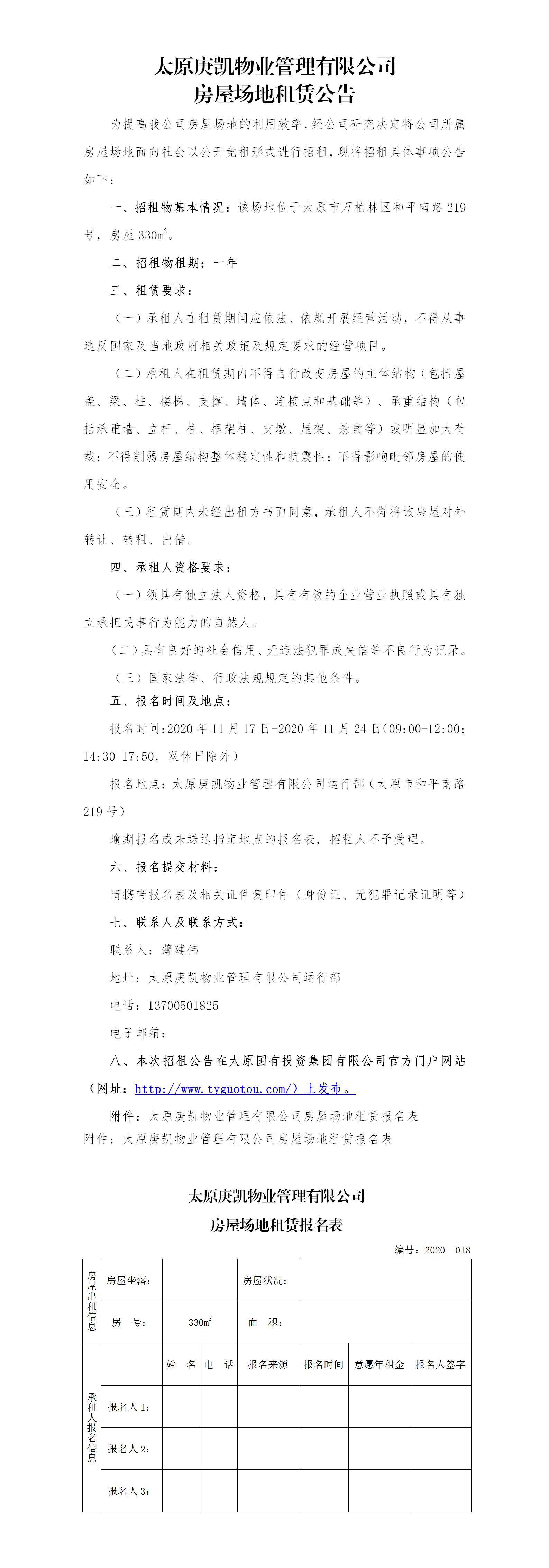 太原庚凱物業(yè)管理有限公司房屋場地租賃公告(十八)