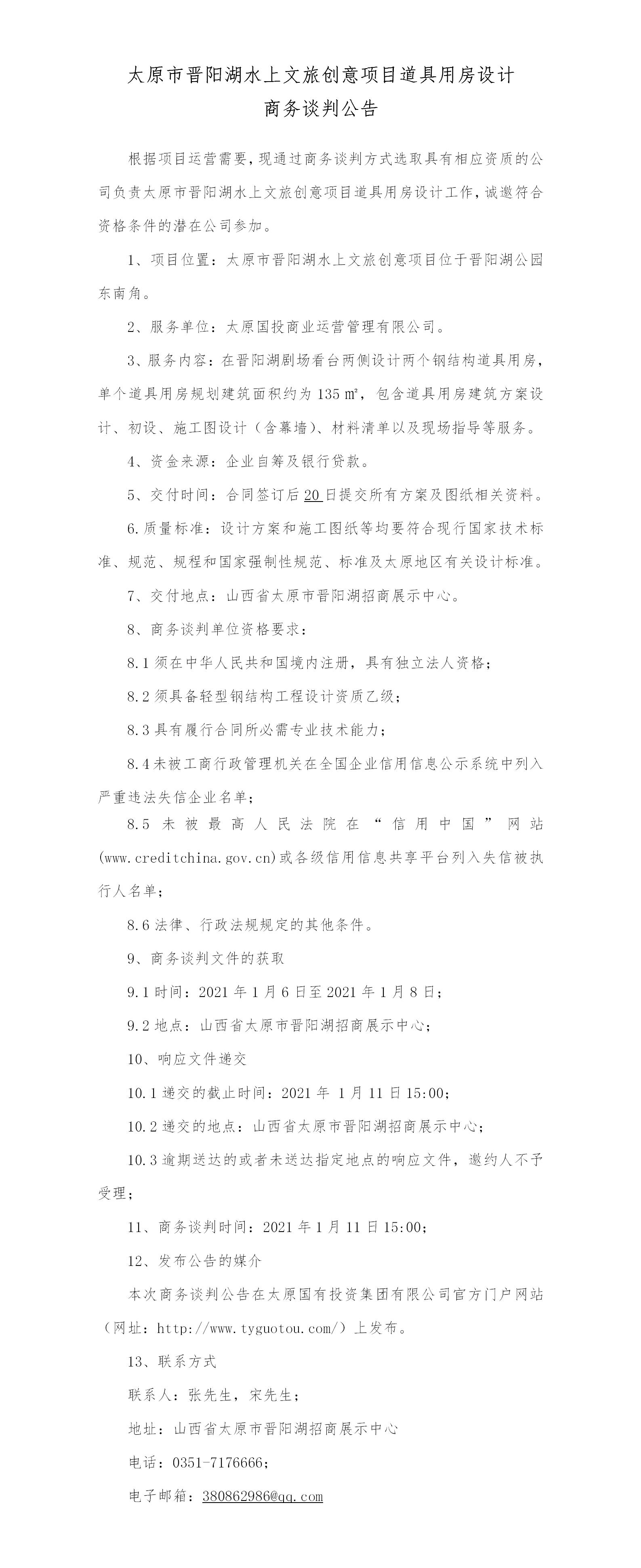 太原市晉陽湖水上文旅創(chuàng)意項目道具用房設(shè)計商務(wù)談判公告