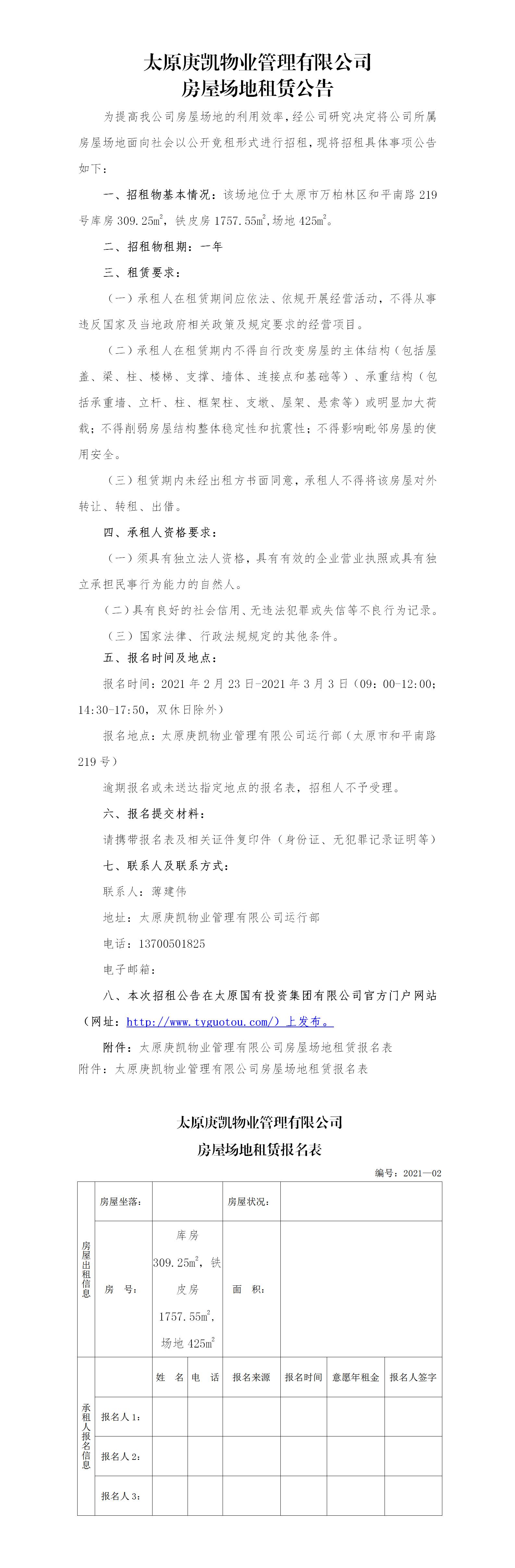 太原庚凱物業(yè)管理有限公司房屋場地租賃公告(二十三)