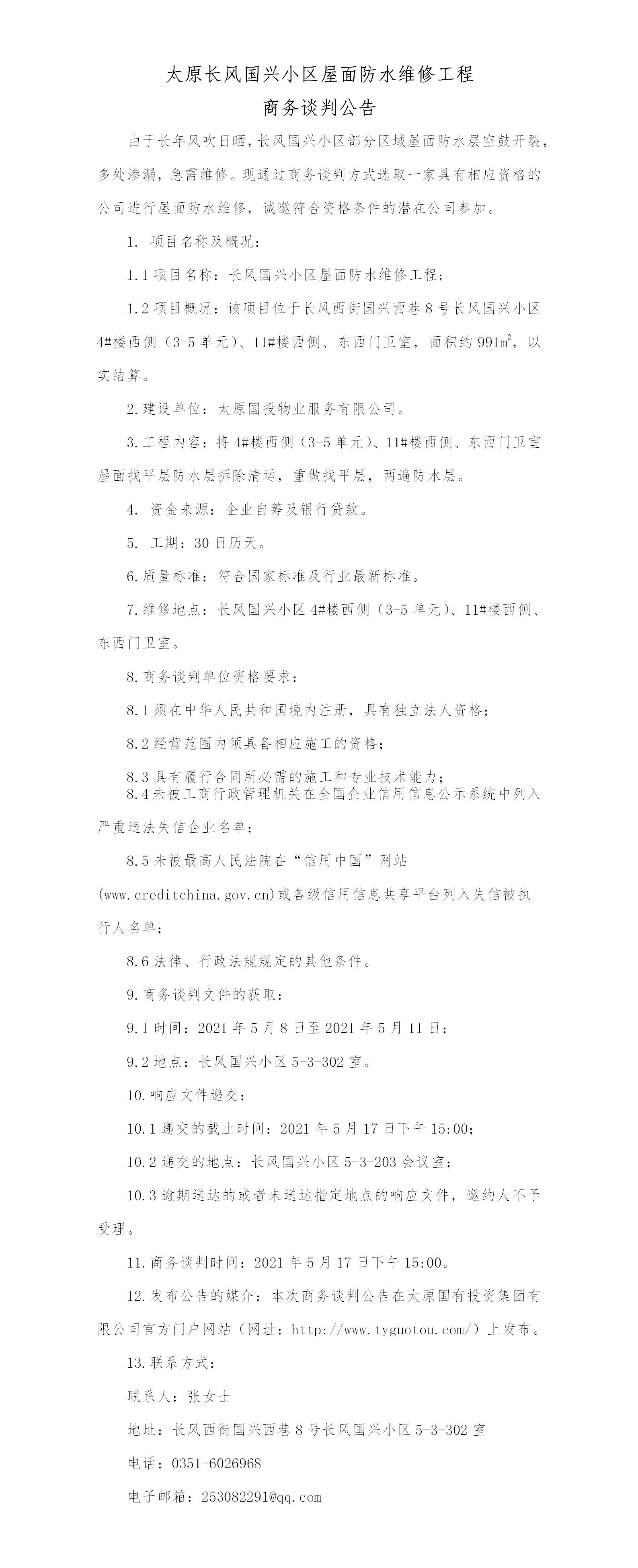 太原長風(fēng)國興小區(qū)屋面防水維修工程商務(wù)談判公告