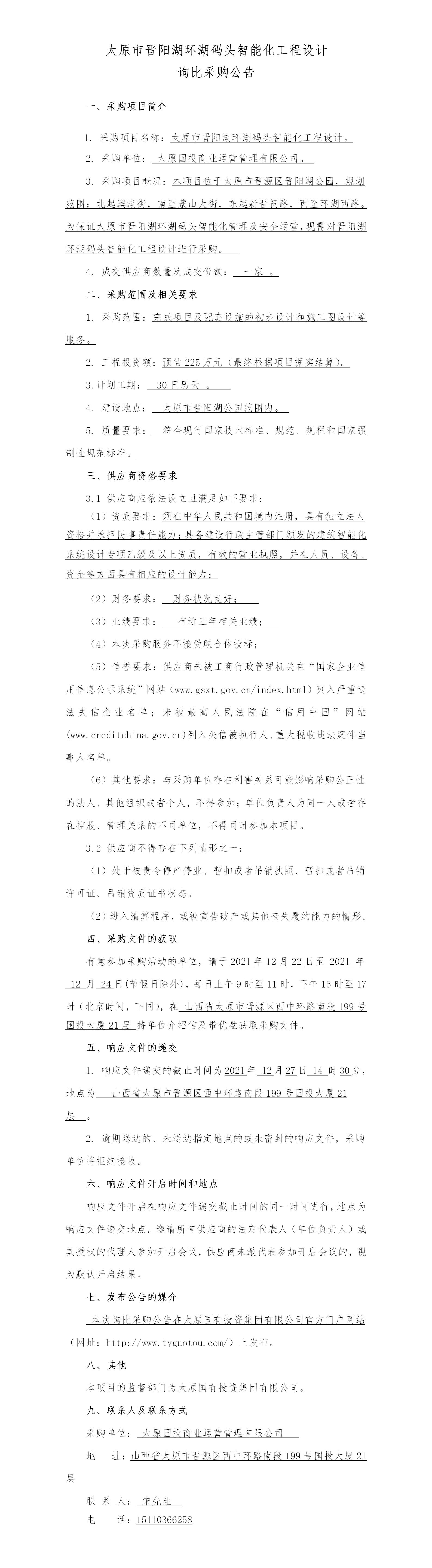 太原市晉陽湖環(huán)湖碼頭智能化工程設計詢比采購公告