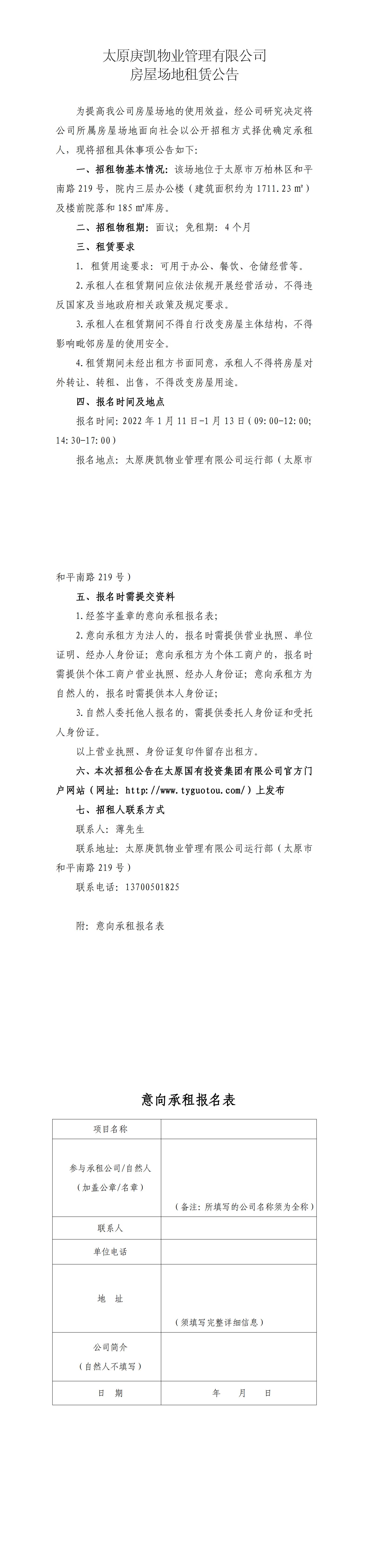 太原庚凱物業(yè)管理有限公司房屋場地租賃公告