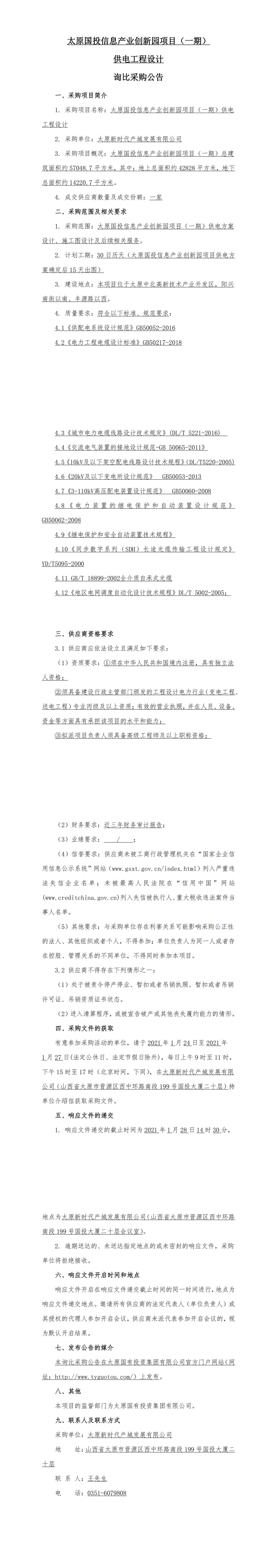 太原國投信息產(chǎn)業(yè)創(chuàng)新園項目(一期)供電工程設(shè)計詢比采購公告