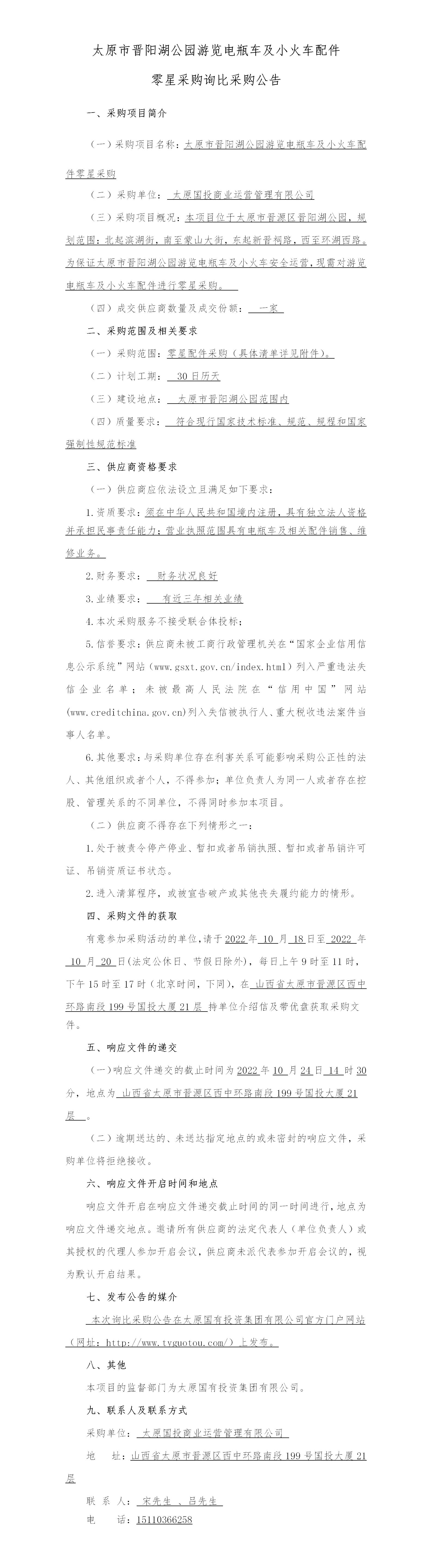 太原市晉陽湖公園游覽電瓶車及小火車配件零星采購詢比采購公告