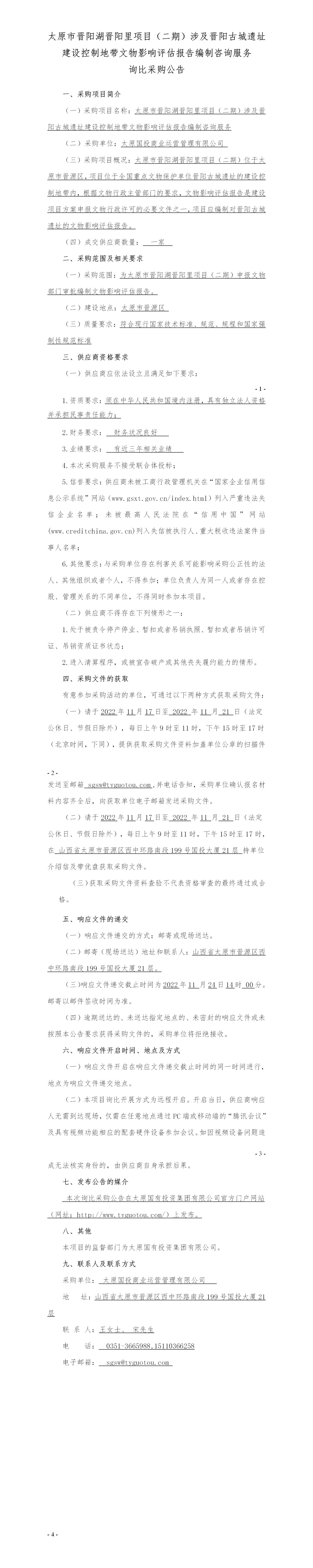 太原市晉陽湖晉陽里項(xiàng)目(二期)涉及晉陽古城遺址建設(shè)控制地帶文物影響評估報(bào)告編制咨詢服務(wù)詢比采購公告