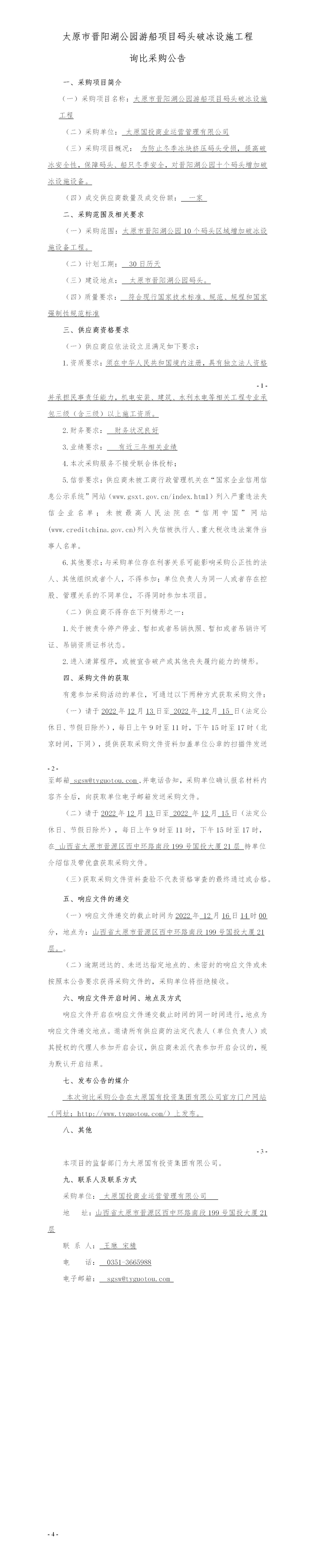太原市晉陽湖公園游船項目碼頭破冰設施工程詢比采購公告