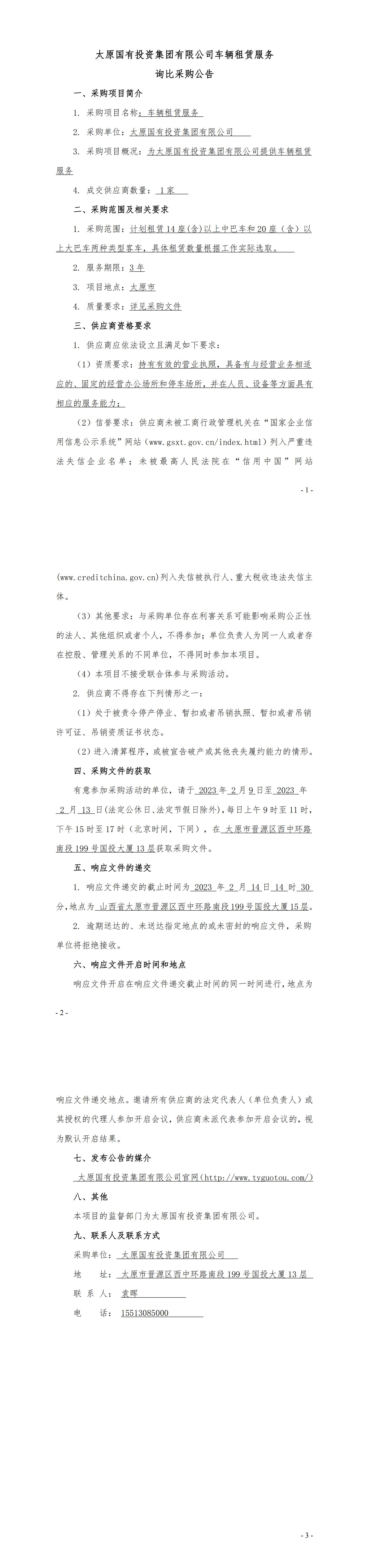 太原國有投資集團有限公司車輛租賃服務(wù)詢比采購公告