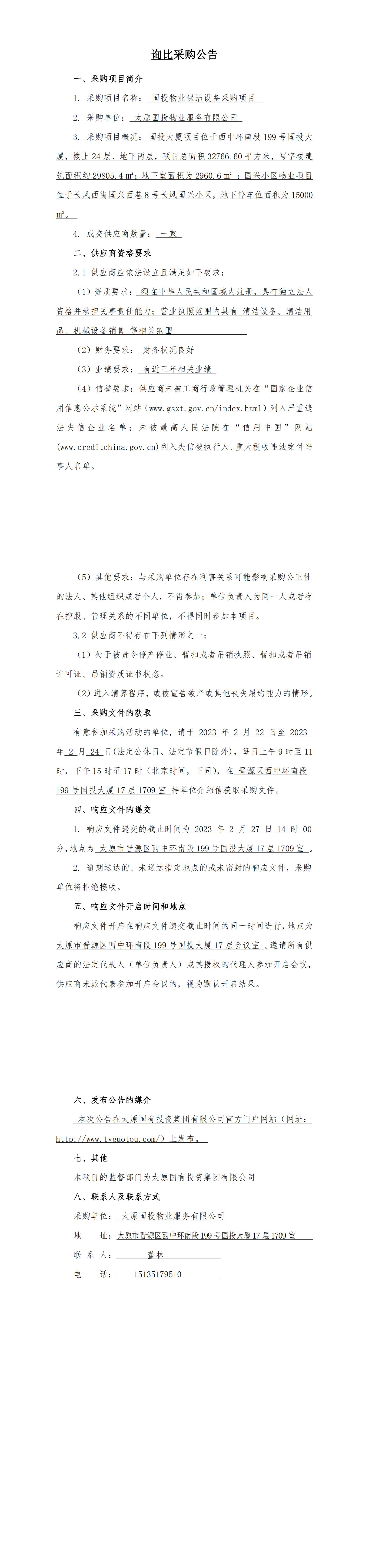 太原國投物業(yè)保潔設(shè)備采購項(xiàng)目詢比采購公告
