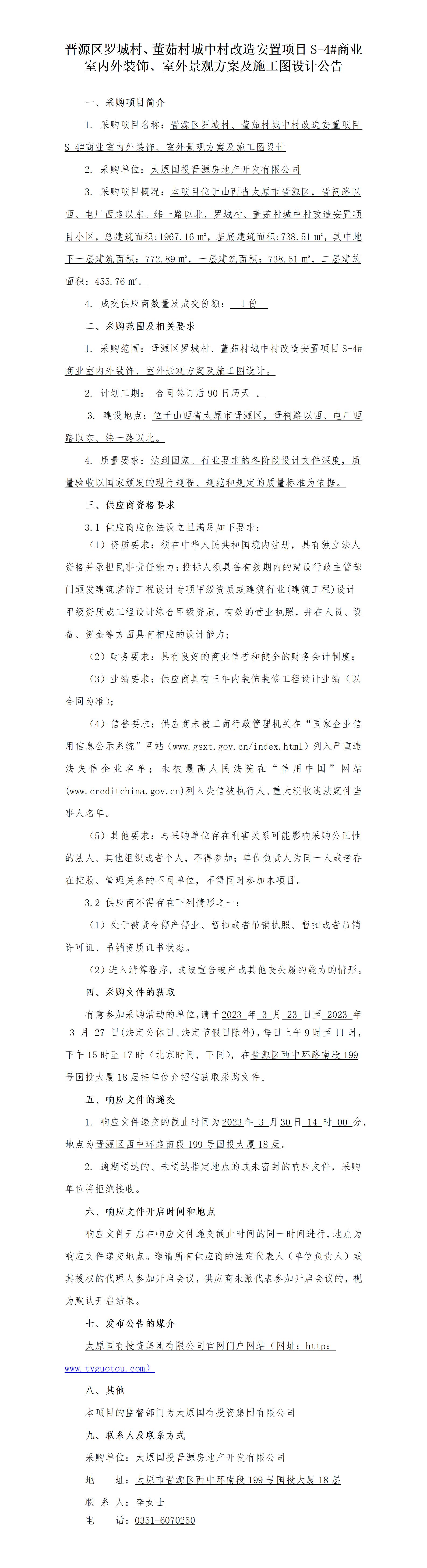 晉源區(qū)羅城村、董茹村城中村改造安置項(xiàng)目S-4#商業(yè)室內(nèi)外裝飾、室外景觀方案及施工圖設(shè)計(jì)公告