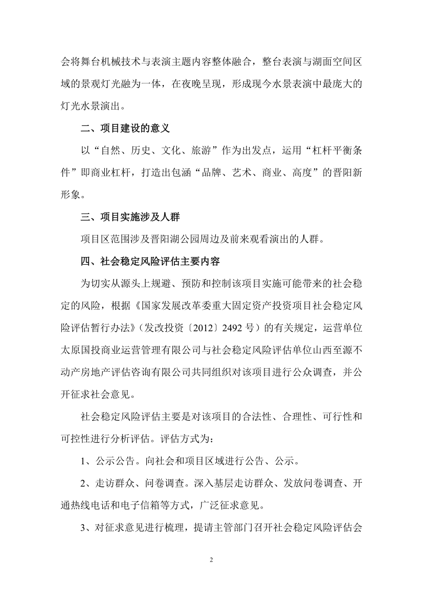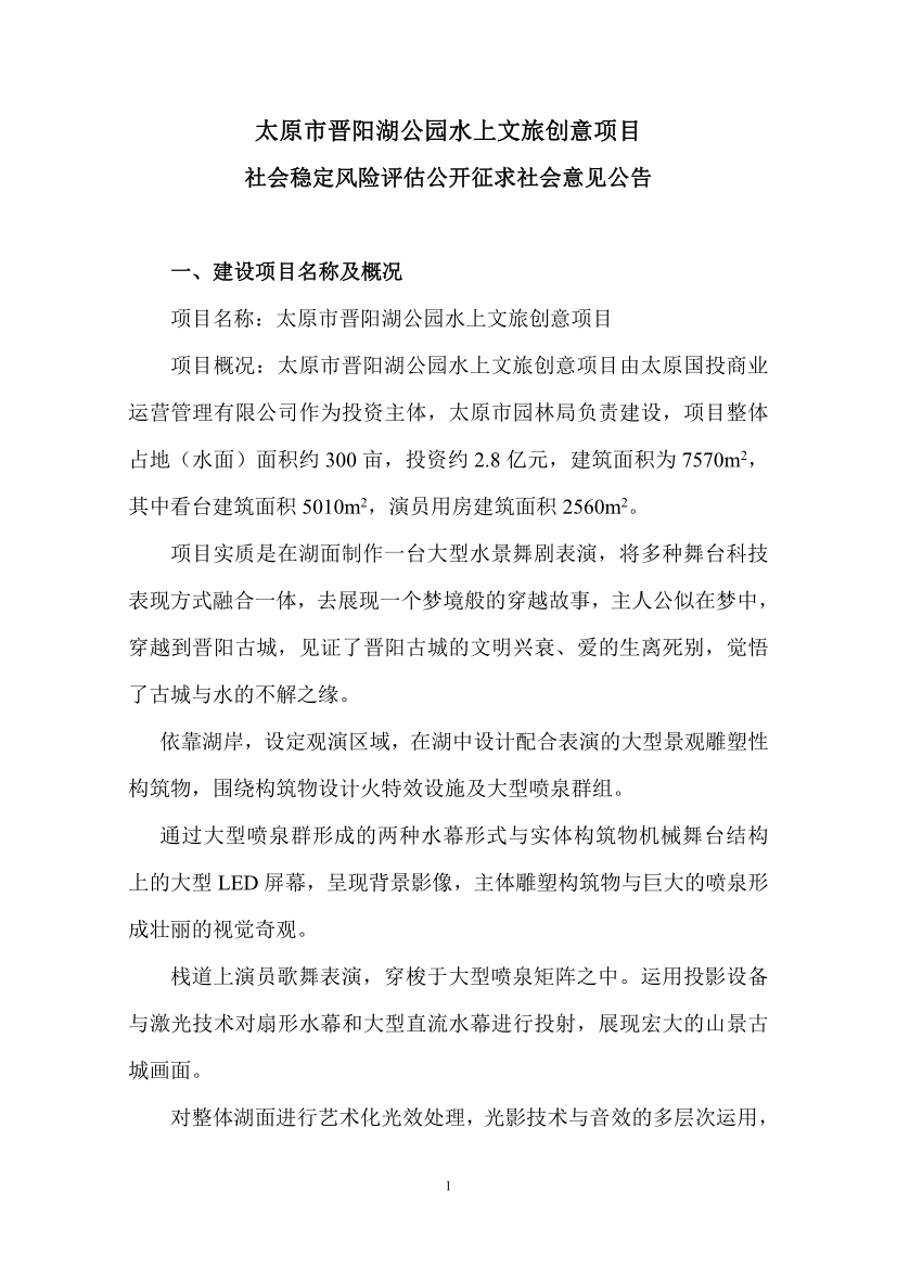 太原市晉陽湖公園水上文旅創(chuàng)意項(xiàng)目社會(huì)穩(wěn)定風(fēng)險(xiǎn)評(píng)估公開征求社會(huì)意見公告