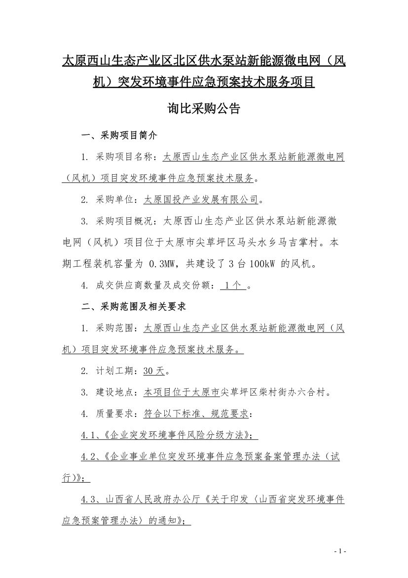 太原西山生態(tài)產(chǎn)業(yè)區(qū)北區(qū)供水泵站新能源微電網(wǎng)風機突發(fā)環(huán)境事件應急預案技術服務項目詢比采購公告