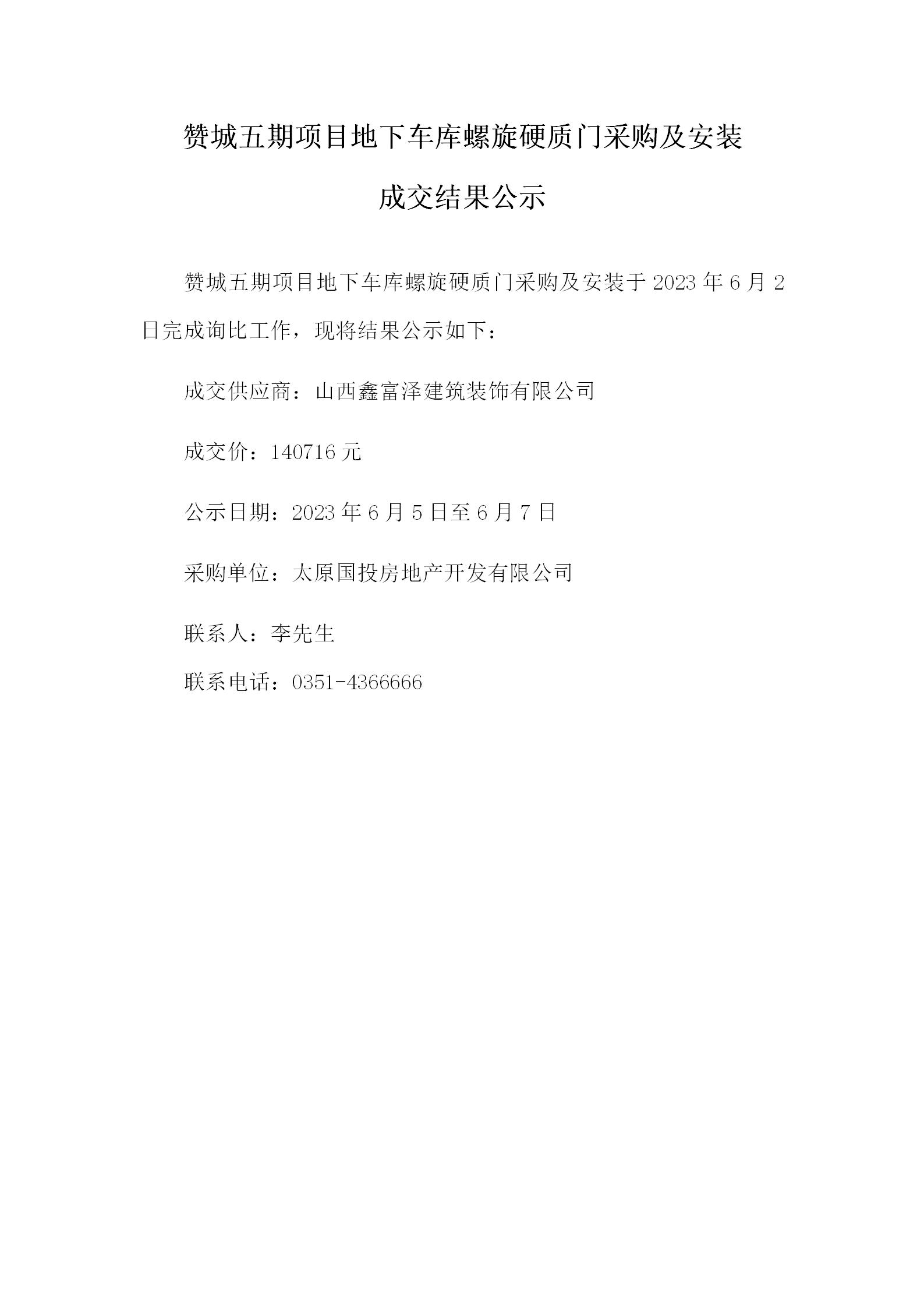 贊城五期項(xiàng)目地下車庫(kù)螺旋硬質(zhì)門采購(gòu)及安裝成交結(jié)果公示