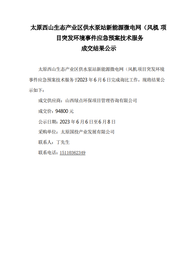太原西山生態(tài)產(chǎn)業(yè)區(qū)供水泵站新能源微電網(wǎng)風(fēng)機(jī)項目突發(fā)環(huán)境事件應(yīng)急預(yù)案技術(shù)服務(wù)采購詢比成交結(jié)果公示
