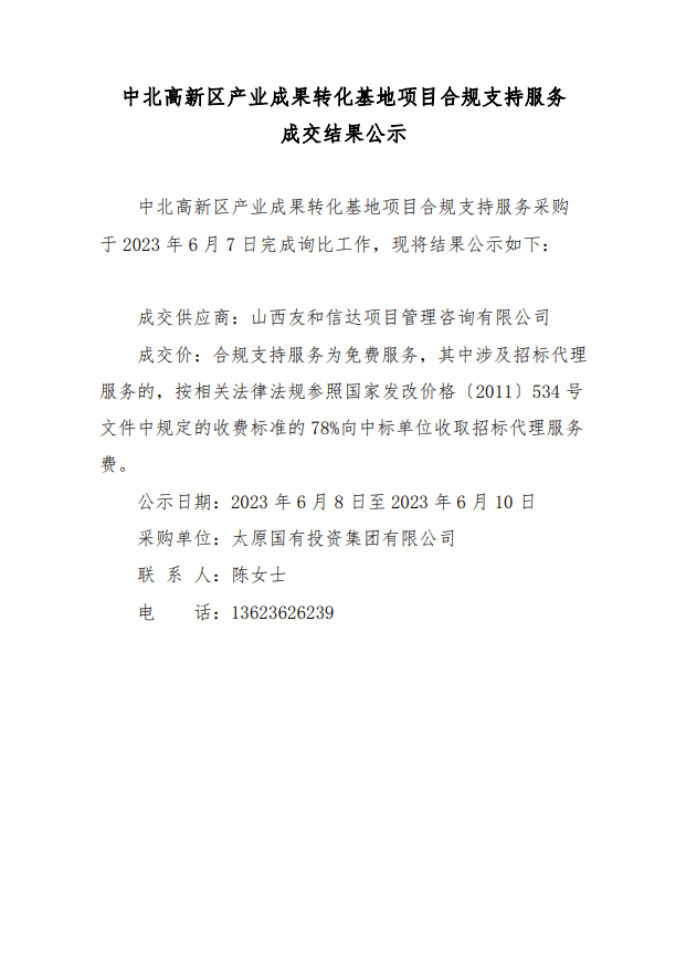 中北高新區(qū)產(chǎn)業(yè)成果轉(zhuǎn)化基地項(xiàng)目合規(guī)支持服務(wù)成交結(jié)果公示
