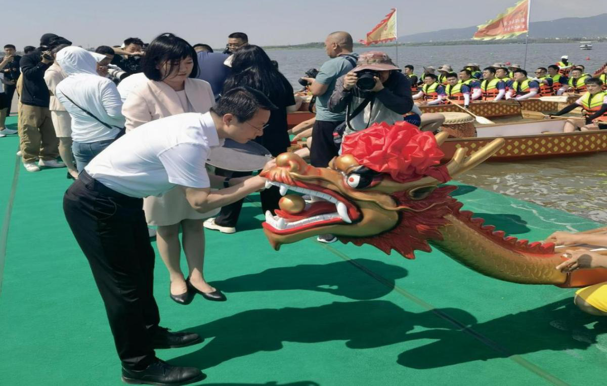 晉源區(qū)委書記張農壽,晉源區(qū)長張耀,省文旅廳處長馮海明,國投集團董事長蘭衛(wèi)軍為本次活動的龍舟“披紅點睛”,一點天庭,吉星高照,鴻運當頭;二點龍鼻,和諧幸福,萬家平安;三點口利,笑口常開,大吉大利;四點龍角,風調雨順,國泰民安;五點龍睛,愿龍舟為大家?guī)斫】怠⒓楹腿缫狻?img src="/FileUpload/image/20230625/20230625100340_5153.png" alt="" />
