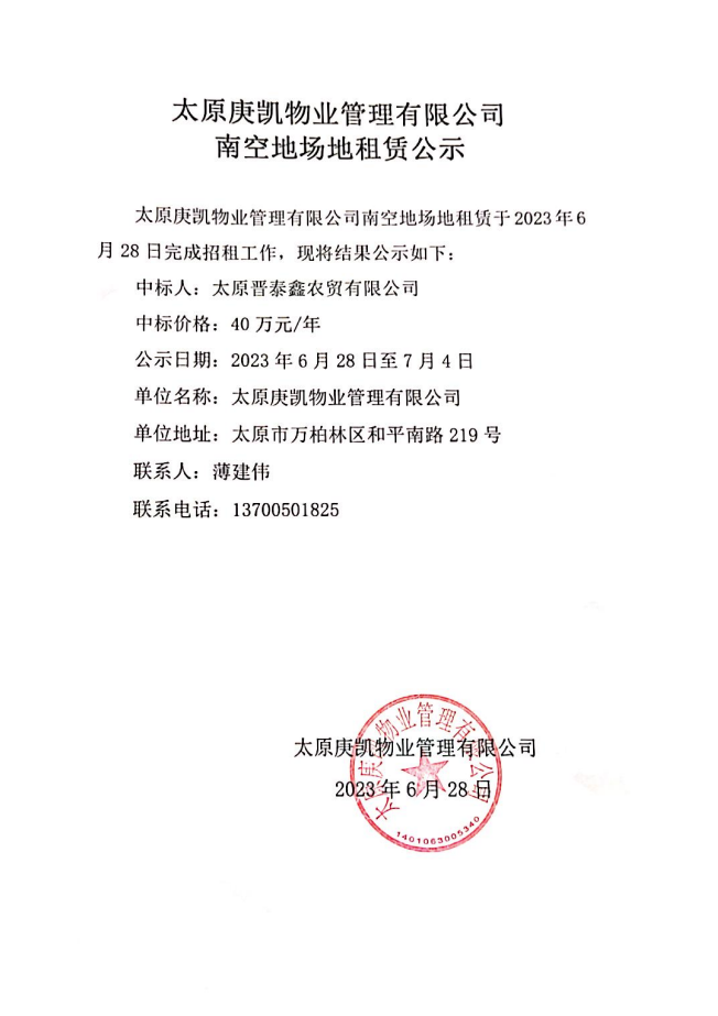 庚凱公司南空地項(xiàng)目場(chǎng)地租賃公示