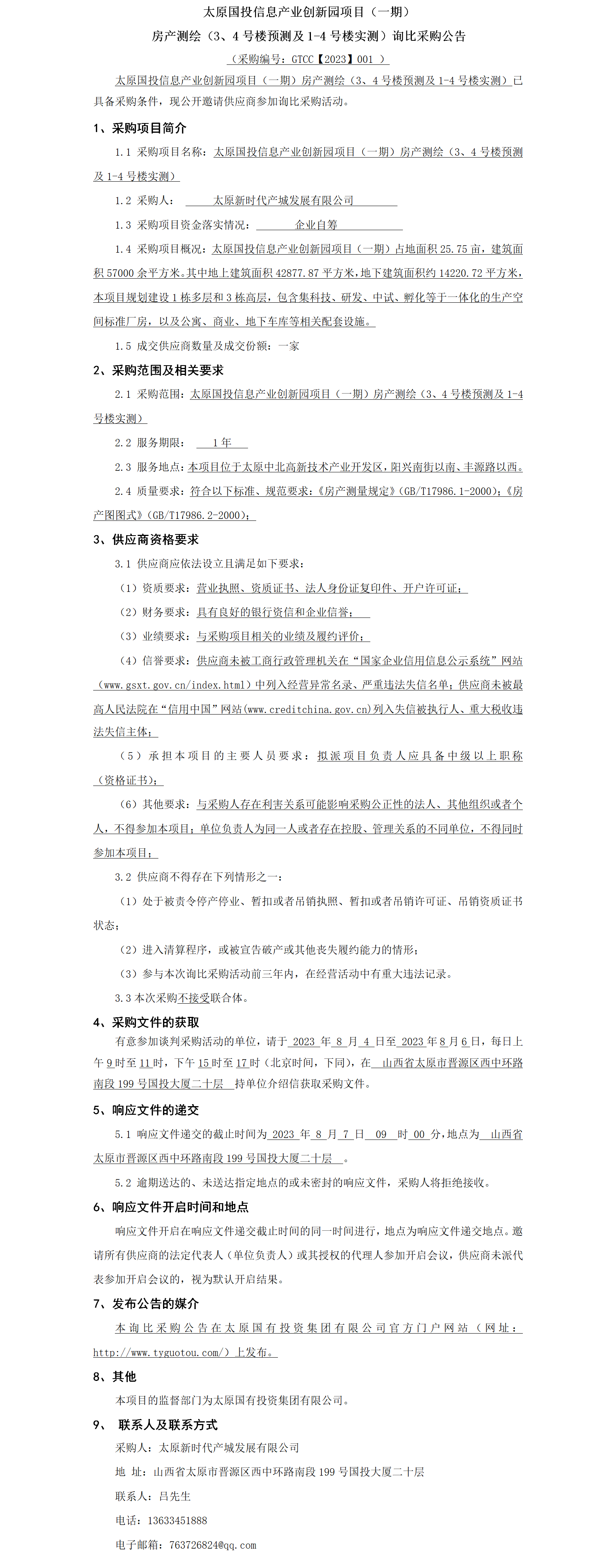 太原國(guó)投信息產(chǎn)業(yè)創(chuàng)新園項(xiàng)目(一期)房產(chǎn)測(cè)繪(3、4號(hào)樓預(yù)測(cè)及1-4號(hào)樓實(shí)測(cè))詢比采購(gòu)公告