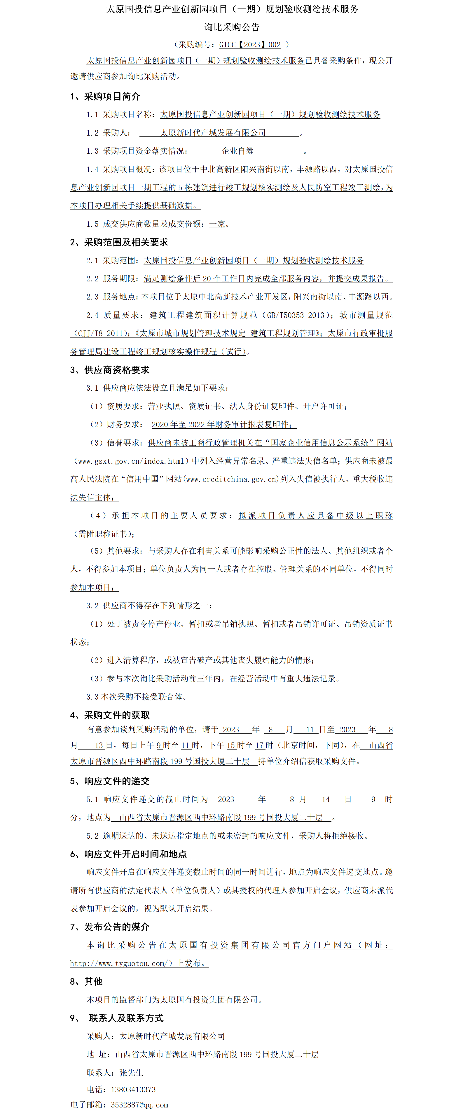 太原國投信息產(chǎn)業(yè)創(chuàng)新園項目(一期)規(guī)劃驗(yàn)收測繪技術(shù)服務(wù) 詢比采購公告