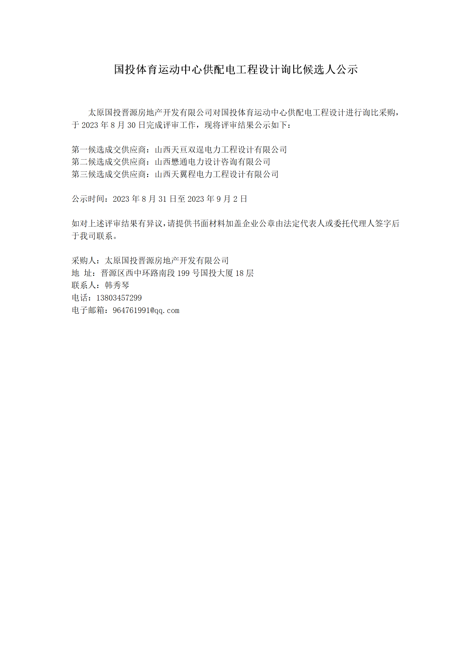 國投體育運(yùn)動(dòng)中心供配電工程設(shè)計(jì)詢比候選人公示