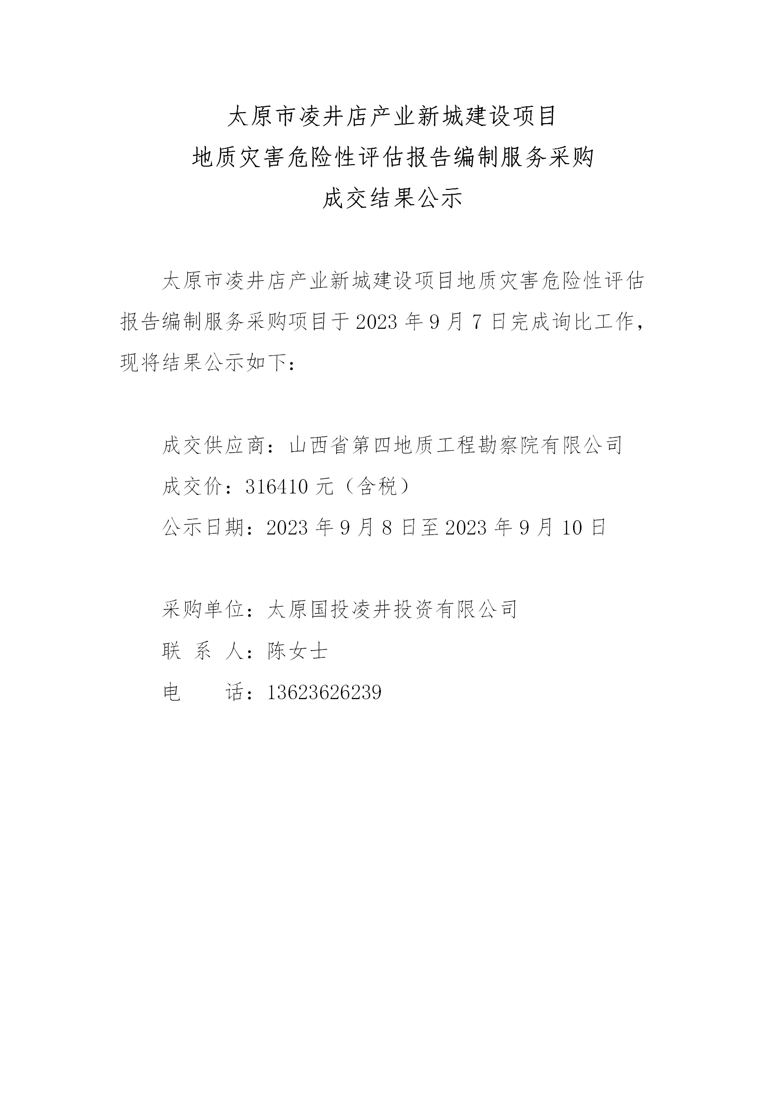 太原市凌井店產(chǎn)業(yè)新城建設(shè)項目地質(zhì)災(zāi)害危險性評估報告編制服務(wù)采購成交結(jié)果公示