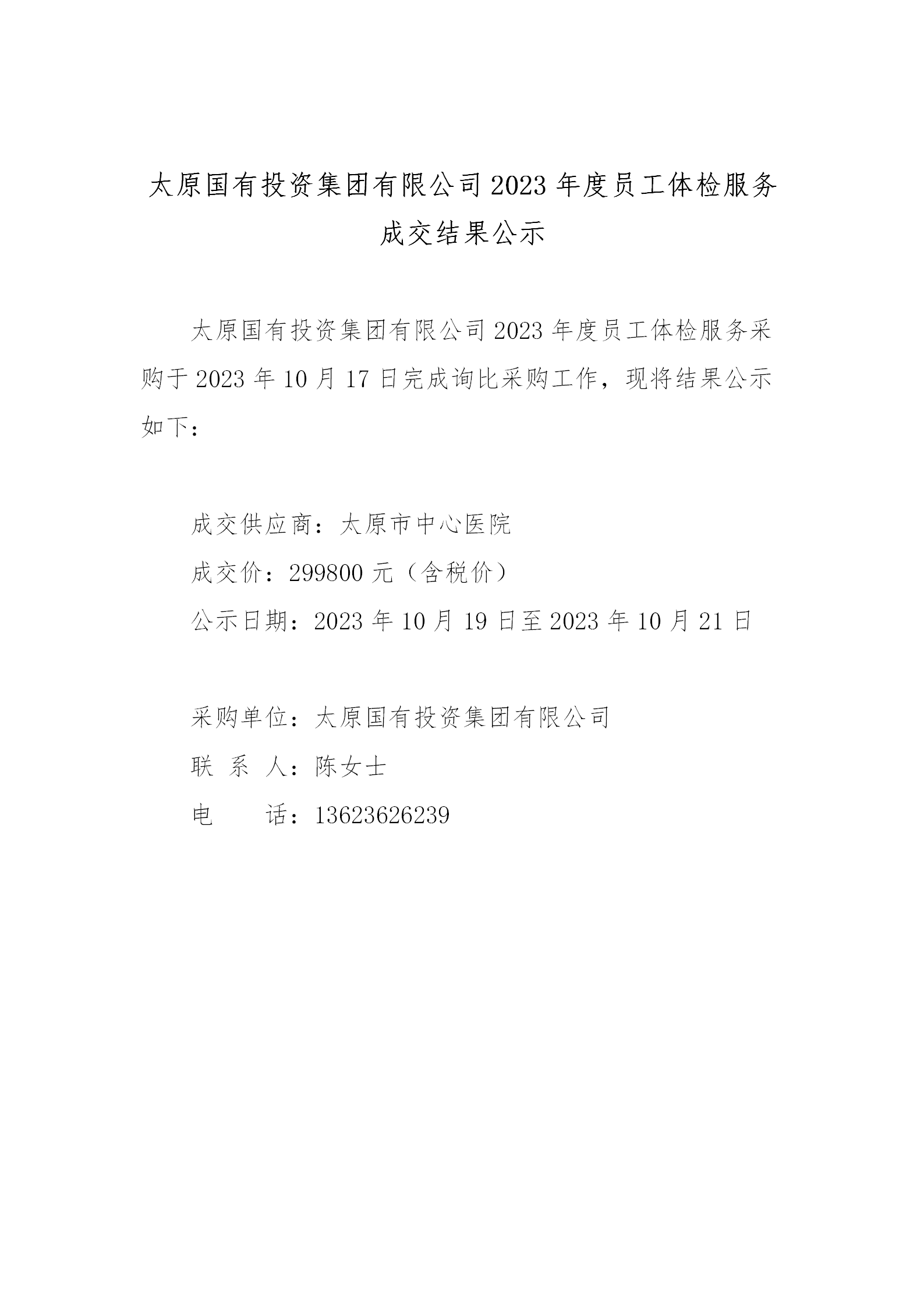 太原國(guó)有投資集團(tuán)有限公司2023年度員工體檢服務(wù)項(xiàng)目詢(xún)比采購(gòu)結(jié)果公示
