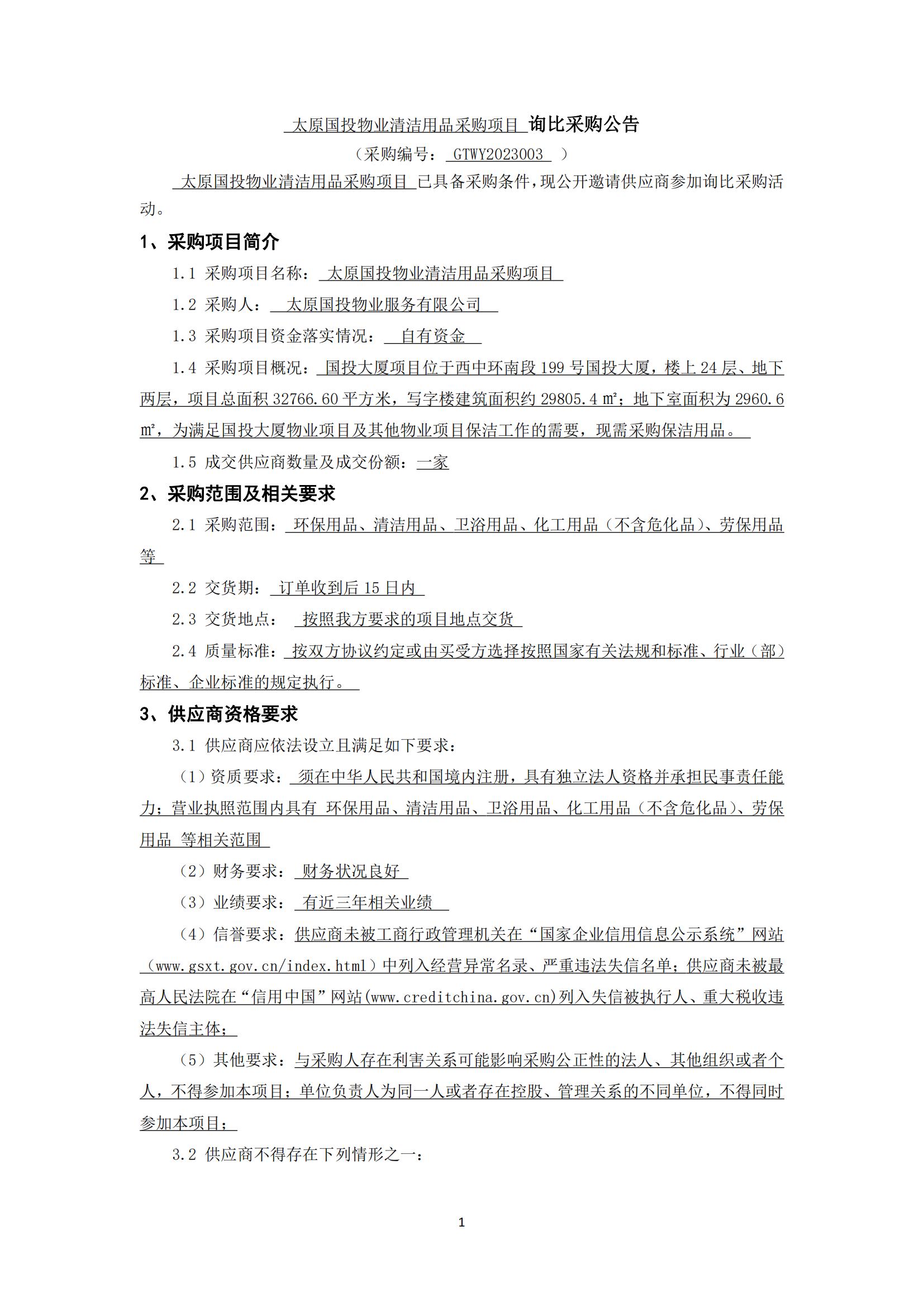 太原國(guó)投物業(yè)清潔用品采購(gòu)項(xiàng)目詢比公告