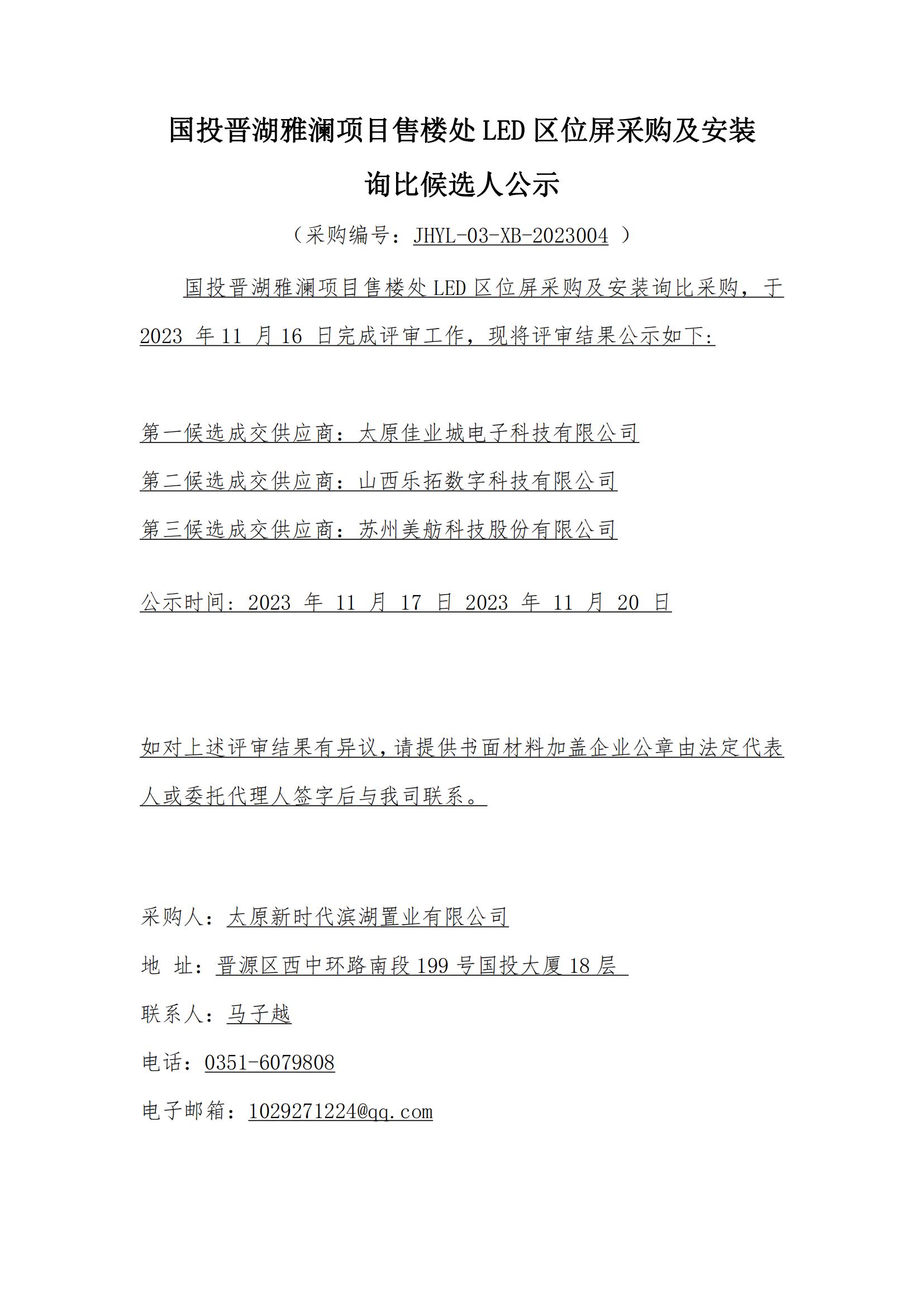 國(guó)投晉湖雅瀾項(xiàng)目售樓處LED區(qū)位屏采購(gòu)及安裝詢比候選人公示
