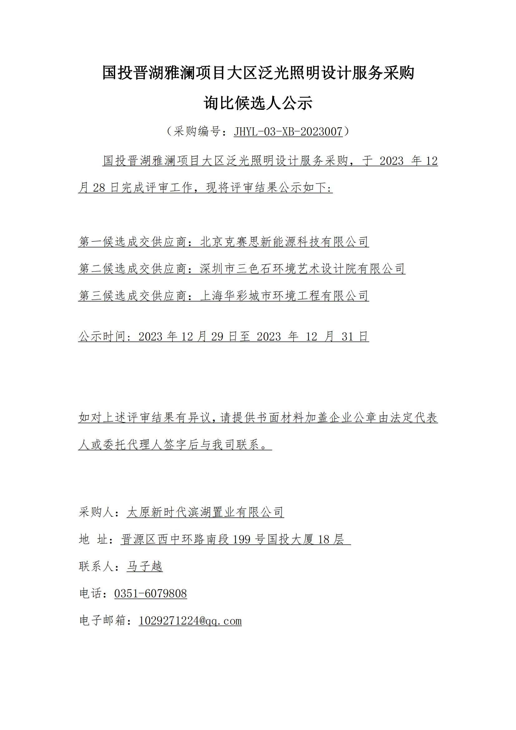 國投晉湖雅瀾項目大區(qū)泛光照明設計服務采購詢比候選人公示