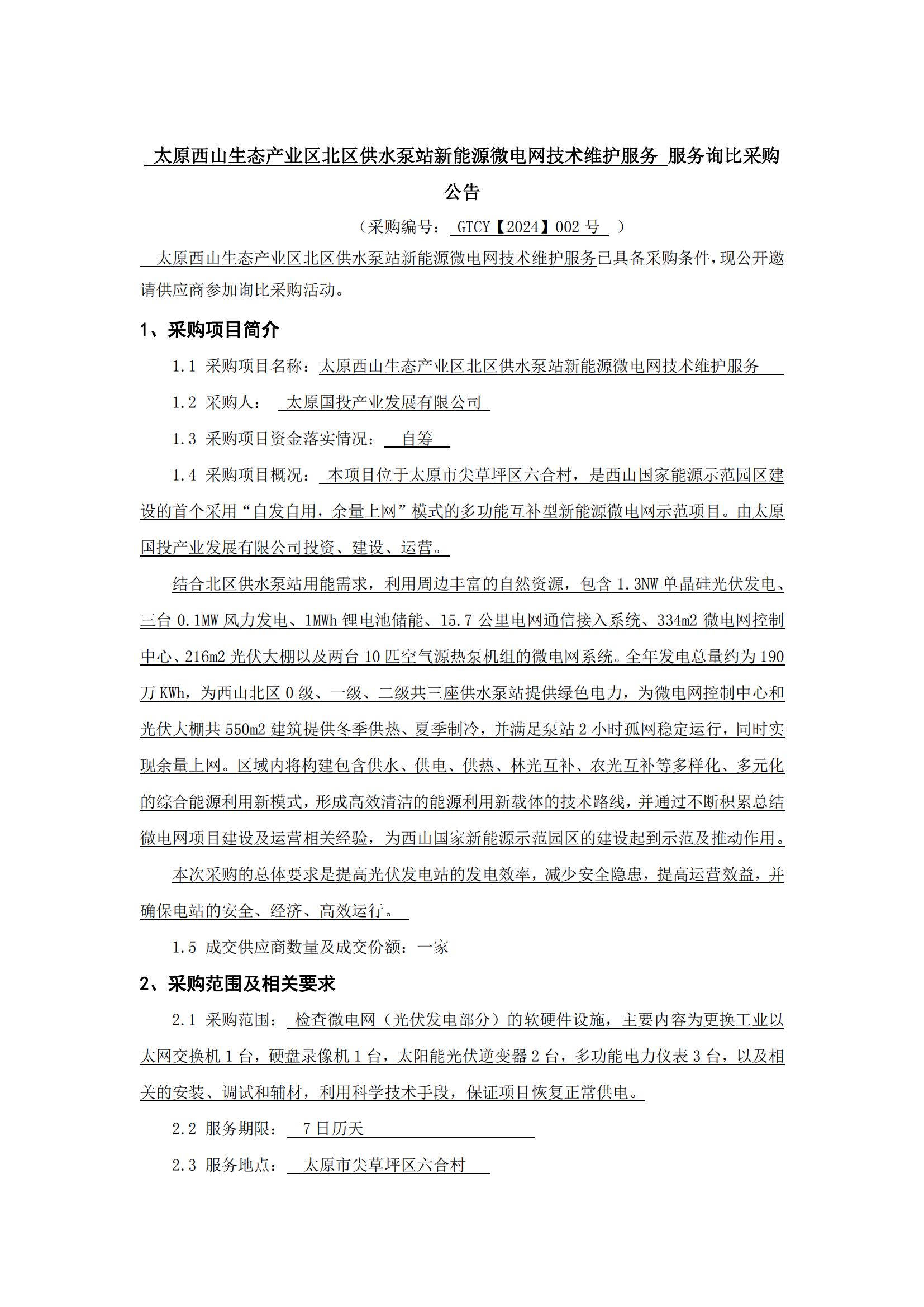 太原西山生態(tài)產(chǎn)業(yè)區(qū)北區(qū)供水泵站新能源微電網(wǎng)技術(shù)維護服務(wù)服務(wù)詢比采購公告