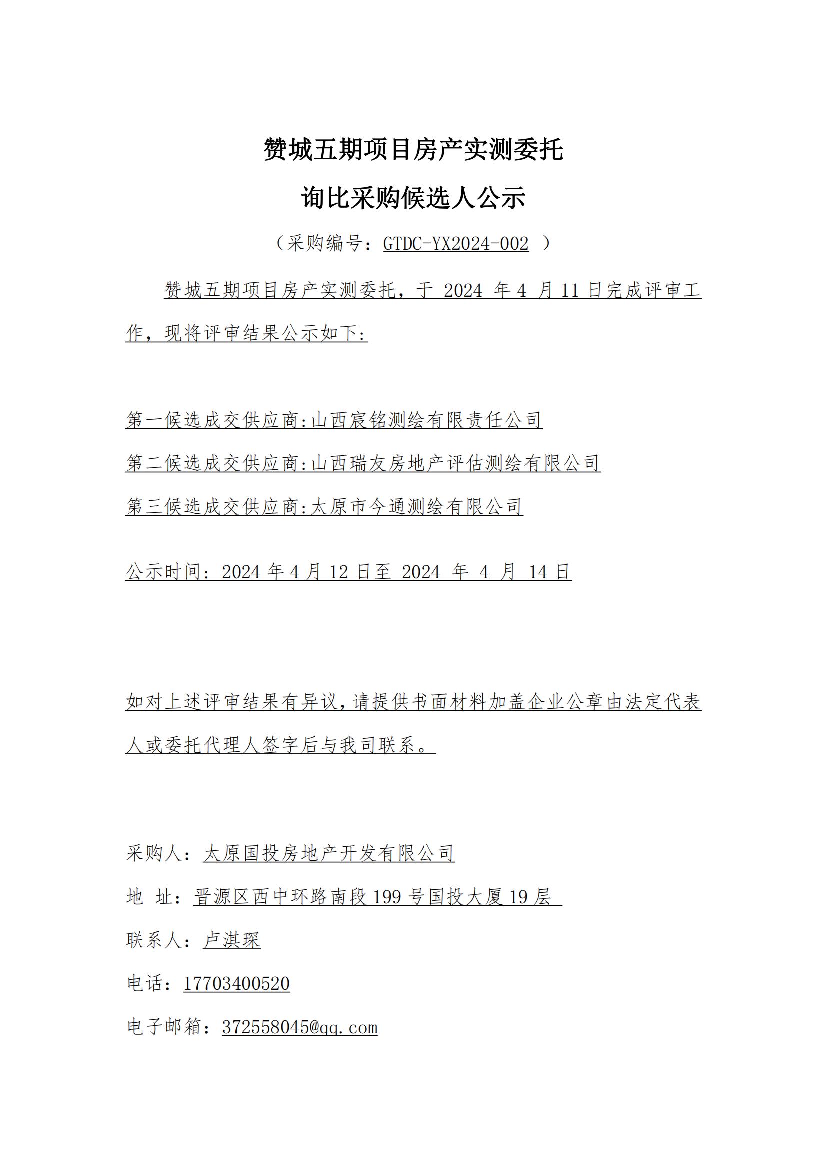 贊城五期項(xiàng)目房產(chǎn)實(shí)測(cè)委托評(píng)估詢(xún)比采購(gòu)候選人公示