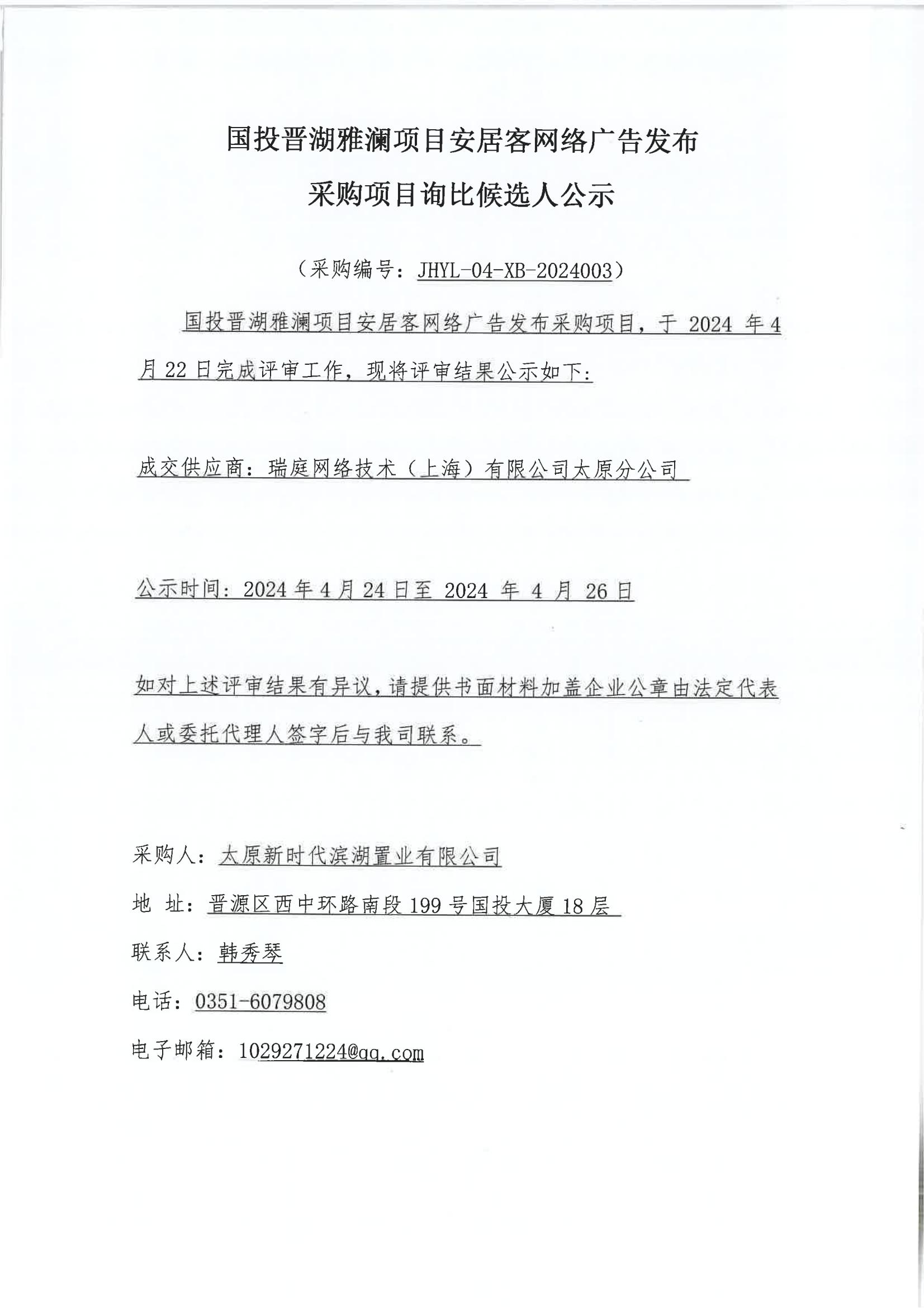 國投晉湖雅瀾項目安居客網(wǎng)絡廣告發(fā)布采購項目詢比候選人公示