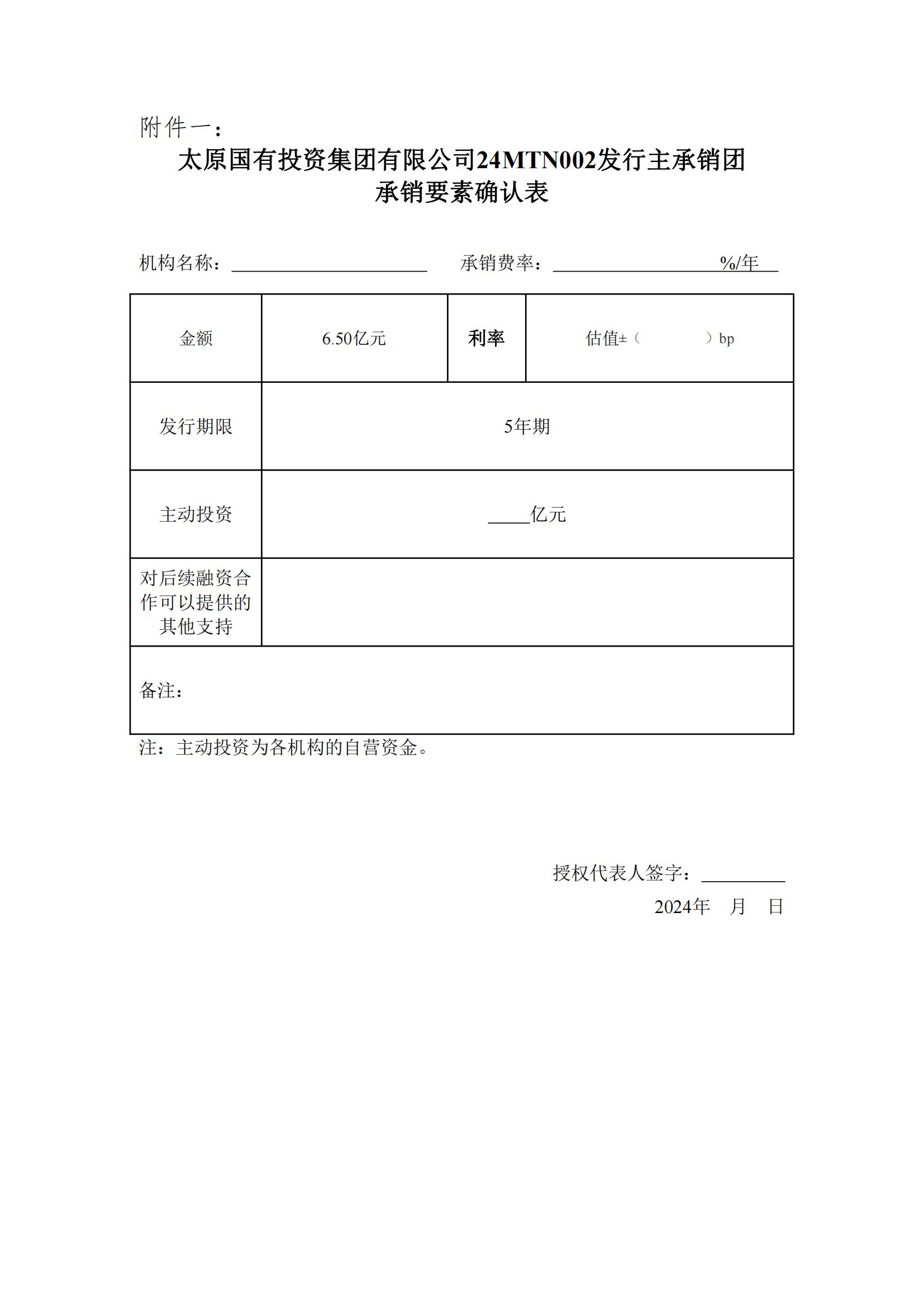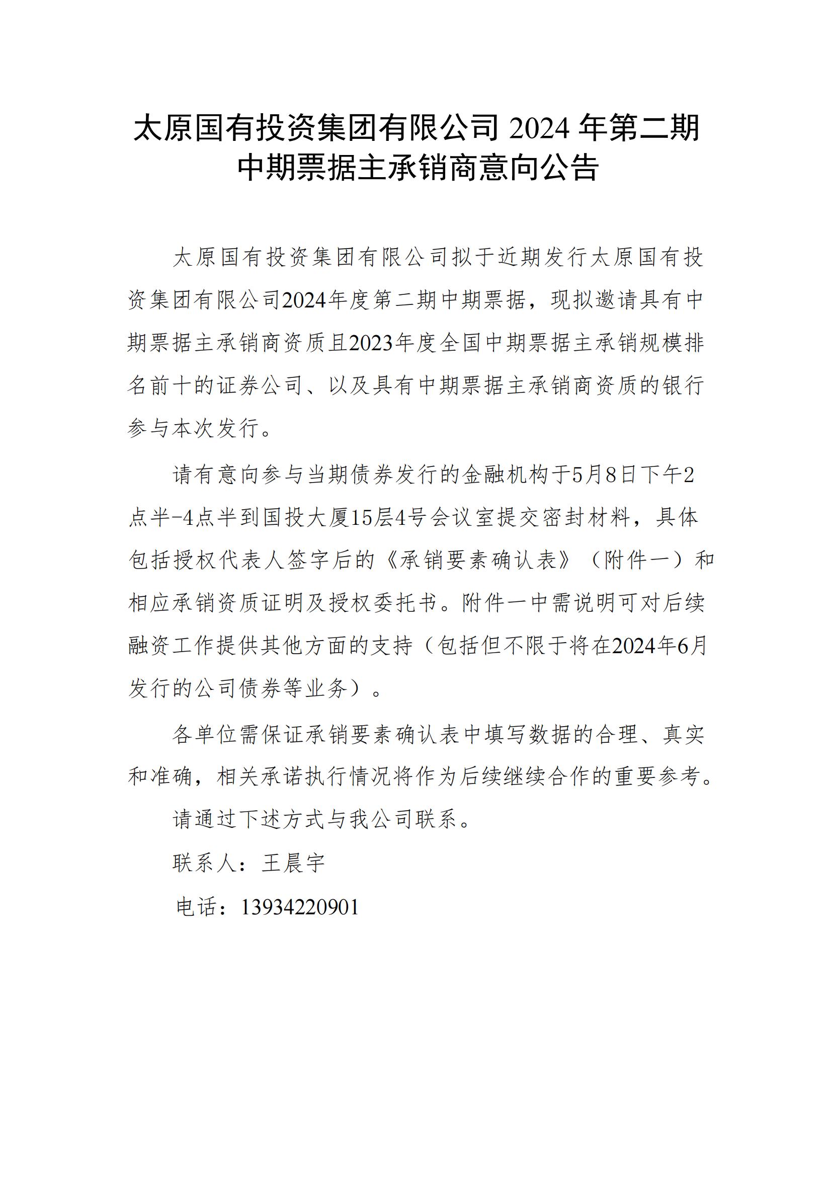 太原國有投資集團有限公司2024年第二期中期票據(jù)主承銷商擇選相關事項的公告