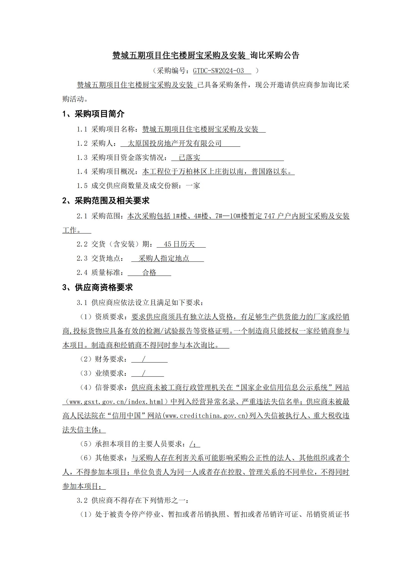 贊城五期項(xiàng)目住宅樓廚寶采購(gòu)及安裝詢比采購(gòu)公告