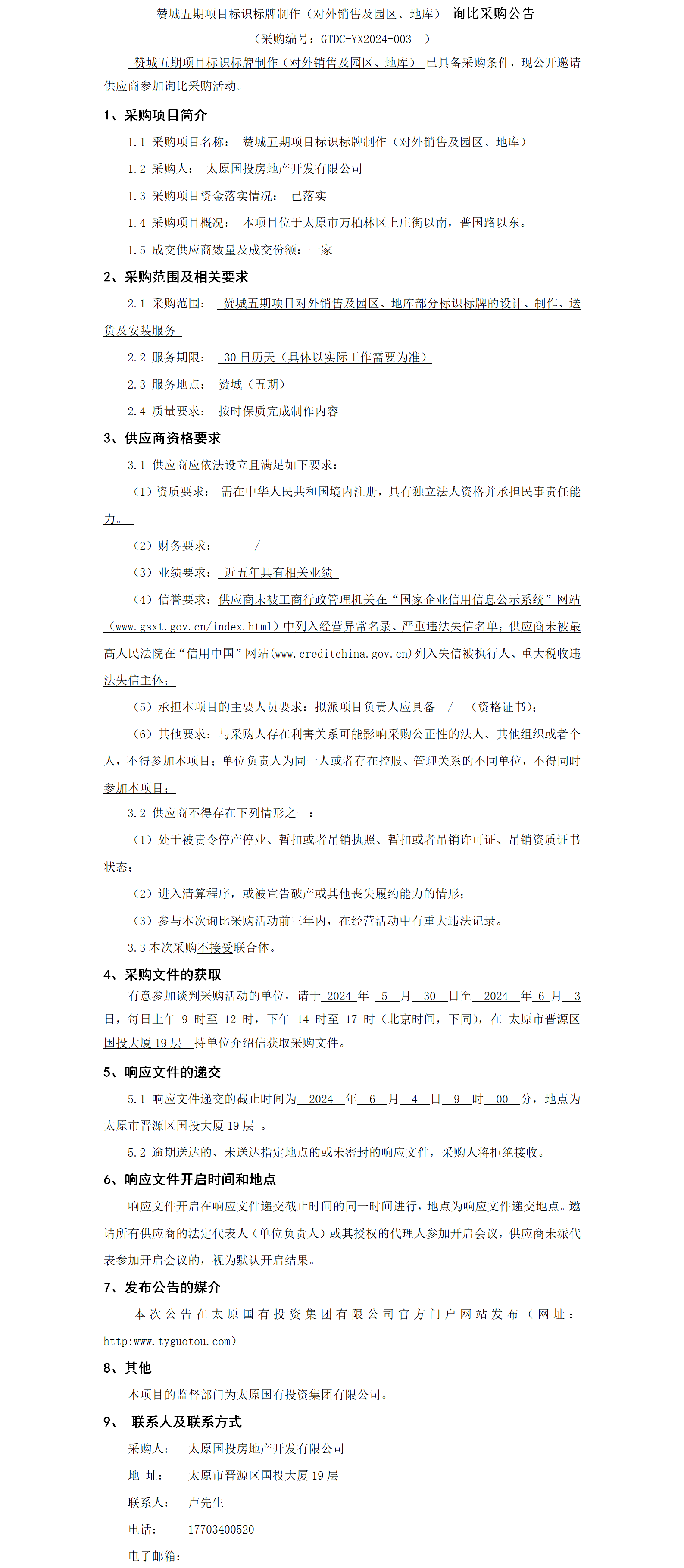 贊城五期項(xiàng)目標(biāo)識標(biāo)牌制作(對外銷售及園區(qū)、地庫) 詢比采購公告