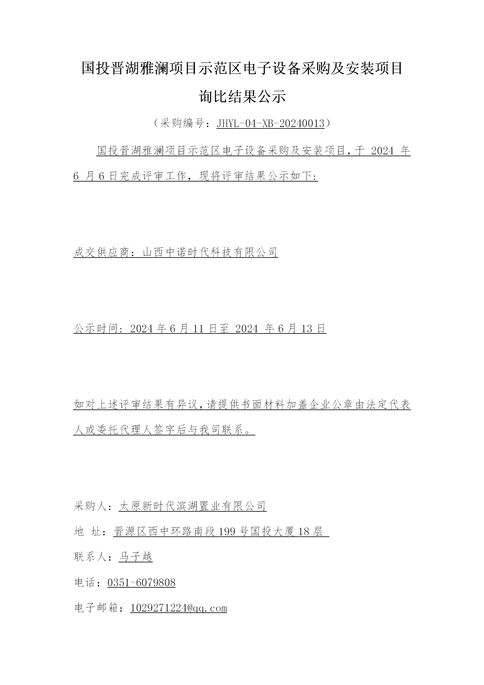 國投晉湖雅瀾項(xiàng)目示范區(qū)電子設(shè)備采購及安裝項(xiàng)目詢比結(jié)果公示