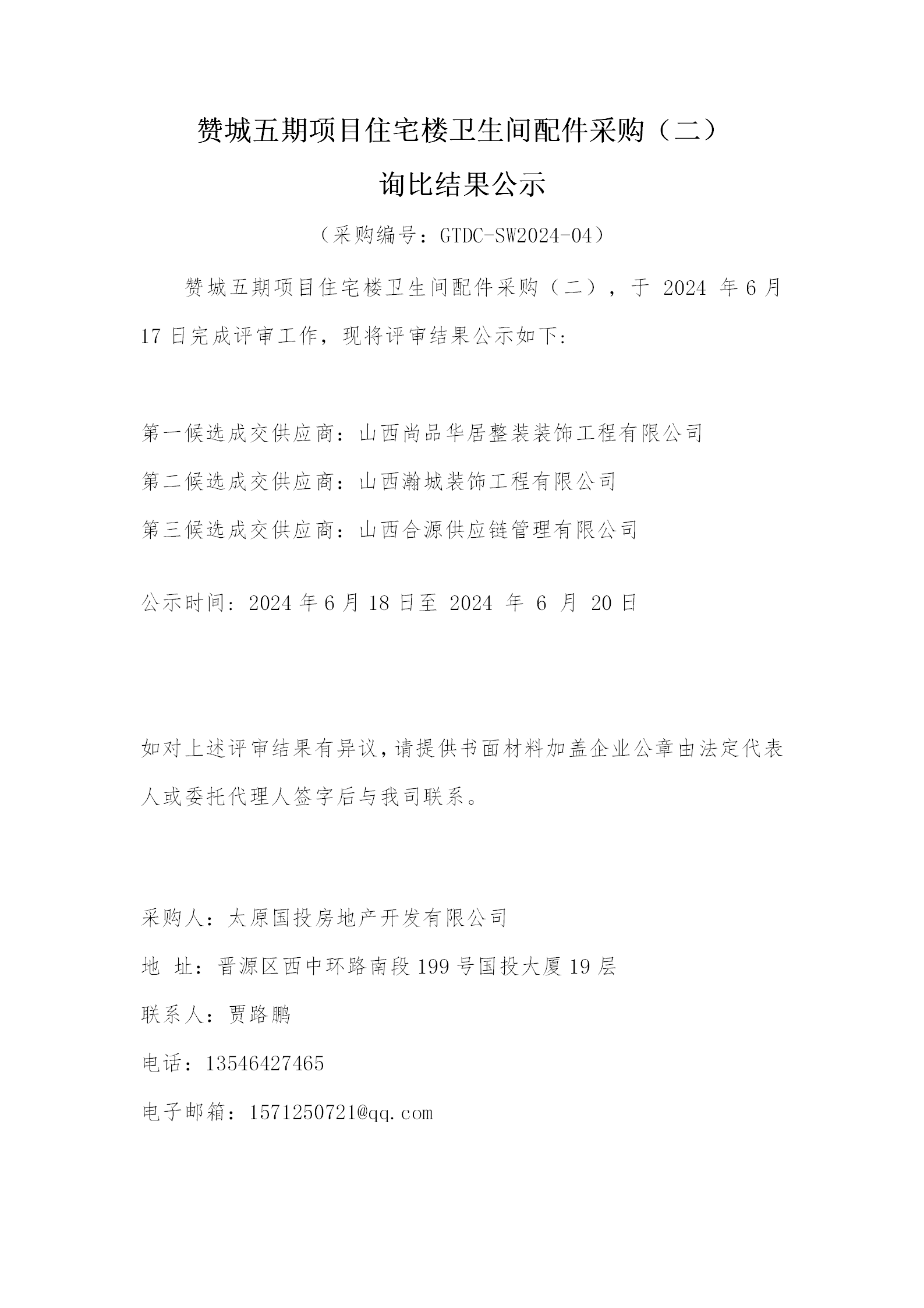 贊城五期項目住宅樓衛(wèi)生間配件采購(二)詢比候選人公示