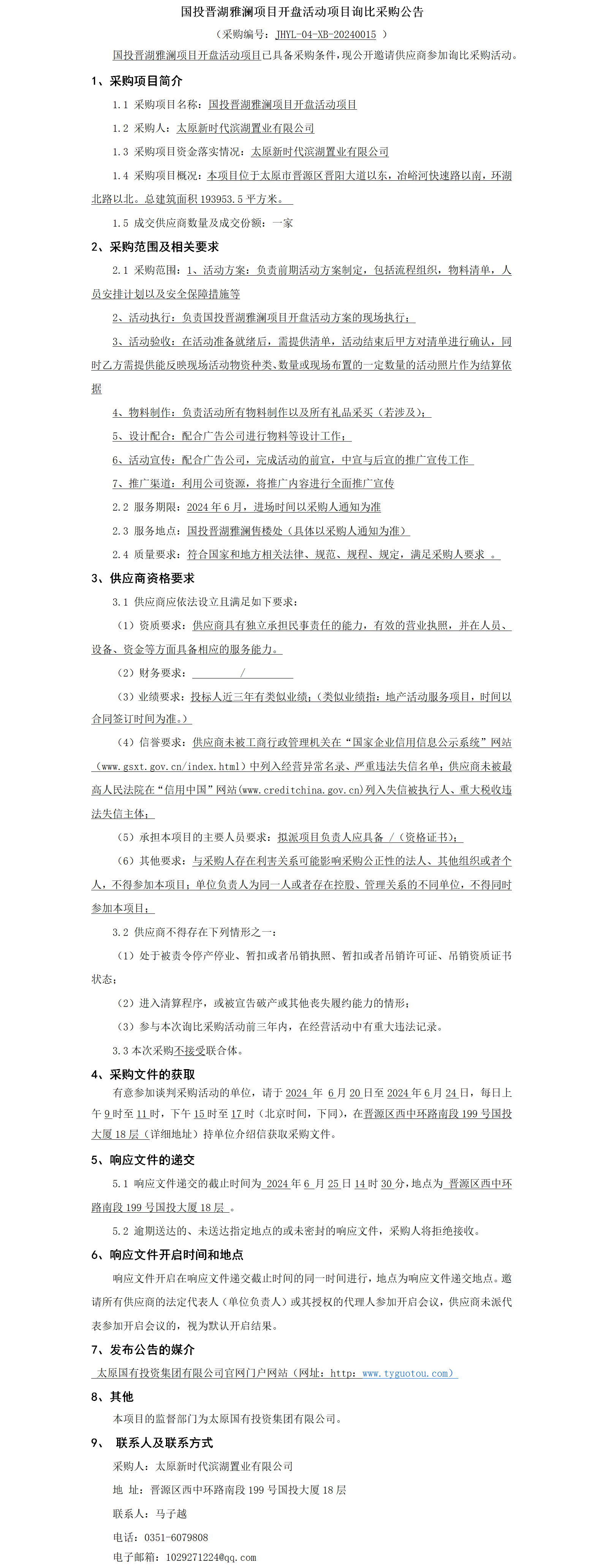 國投晉湖雅瀾項(xiàng)目開盤活動(dòng)項(xiàng)目詢比采購公告