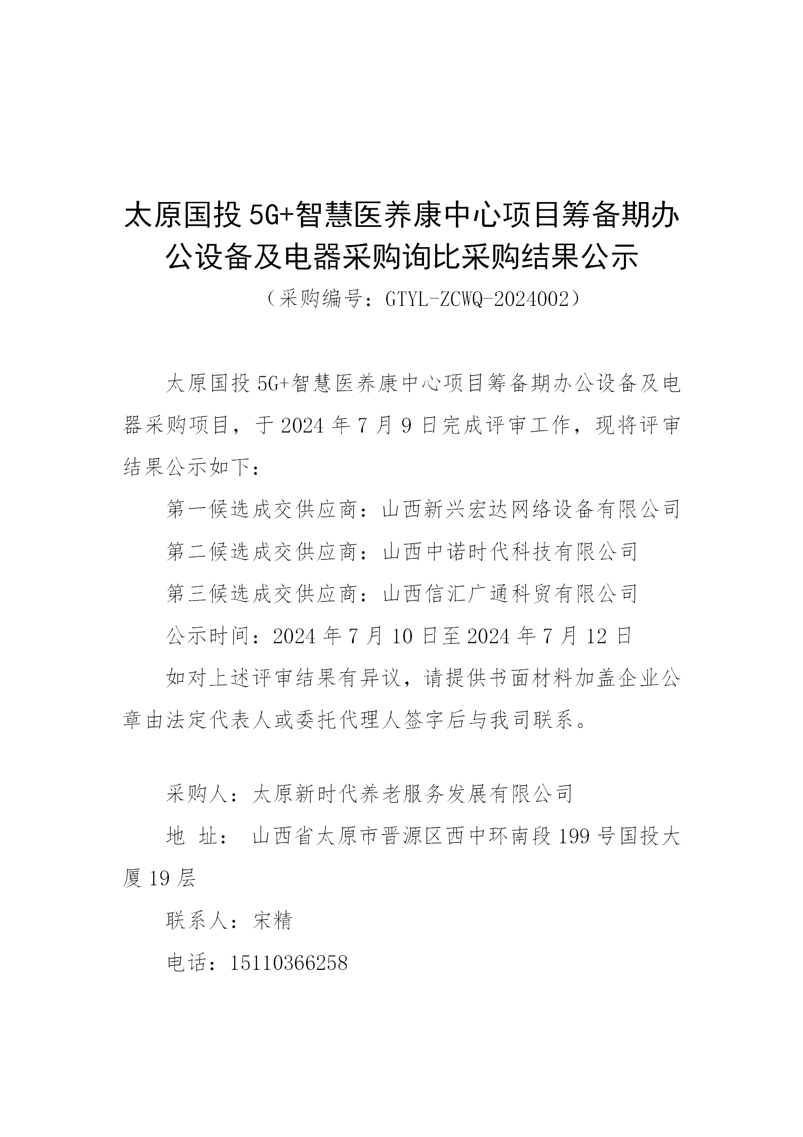 太原國投5G+智慧醫(yī)養(yǎng)康中心項目籌備期辦公設備及電器采購詢比采購結果公示