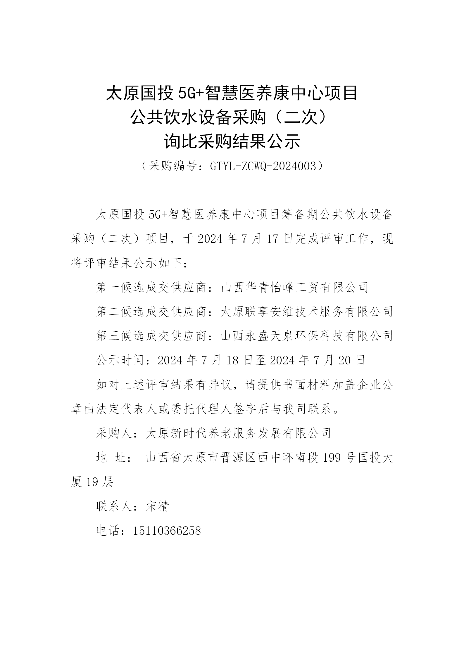 太原國(guó)投5G+智慧醫(yī)養(yǎng)康中心項(xiàng)目公共飲水設(shè)備采購(gòu)(二次)詢比采購(gòu)結(jié)果公示