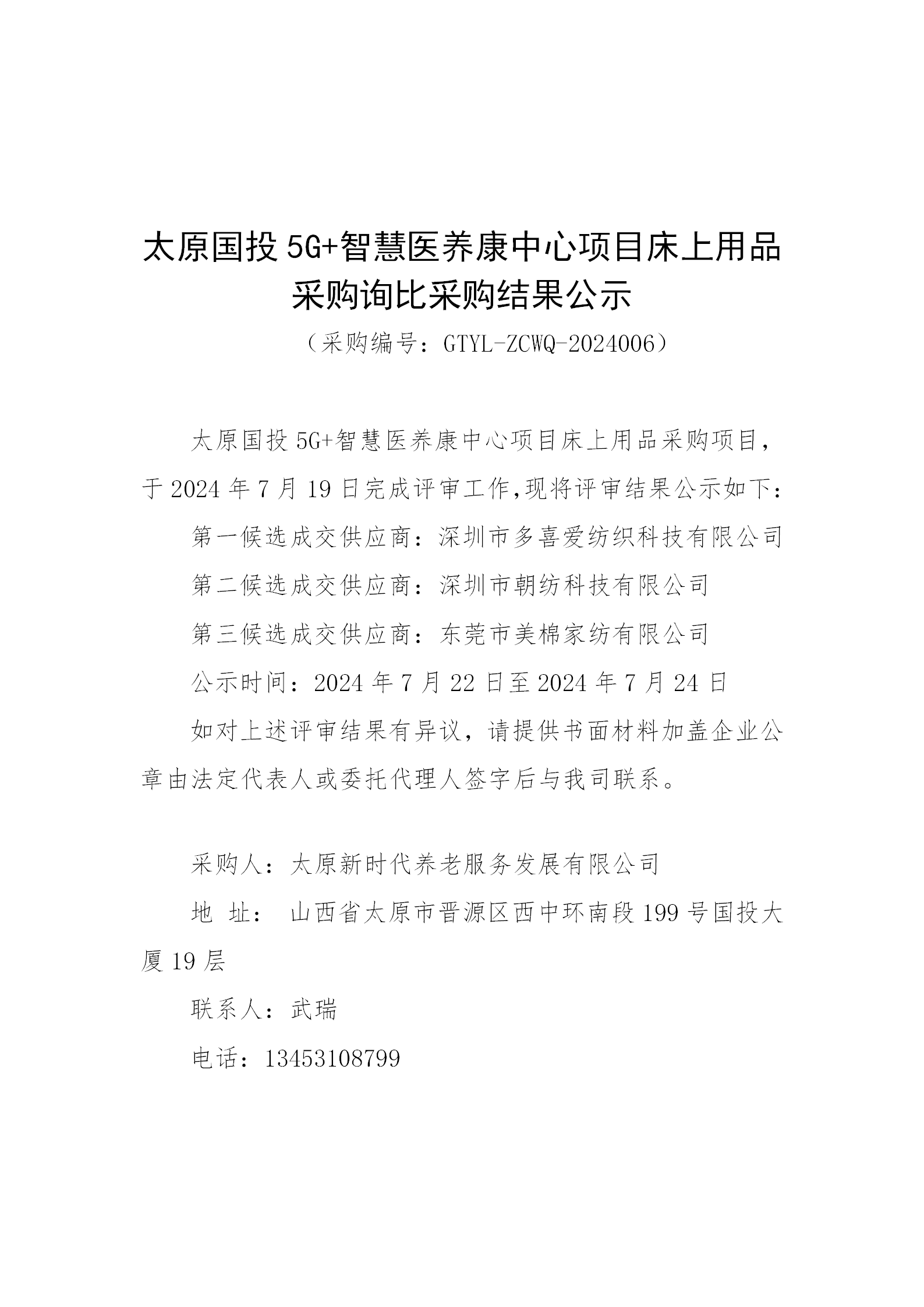 太原國投5G+智慧醫(yī)養(yǎng)康中心項目床上用品采購詢比采購結果公示