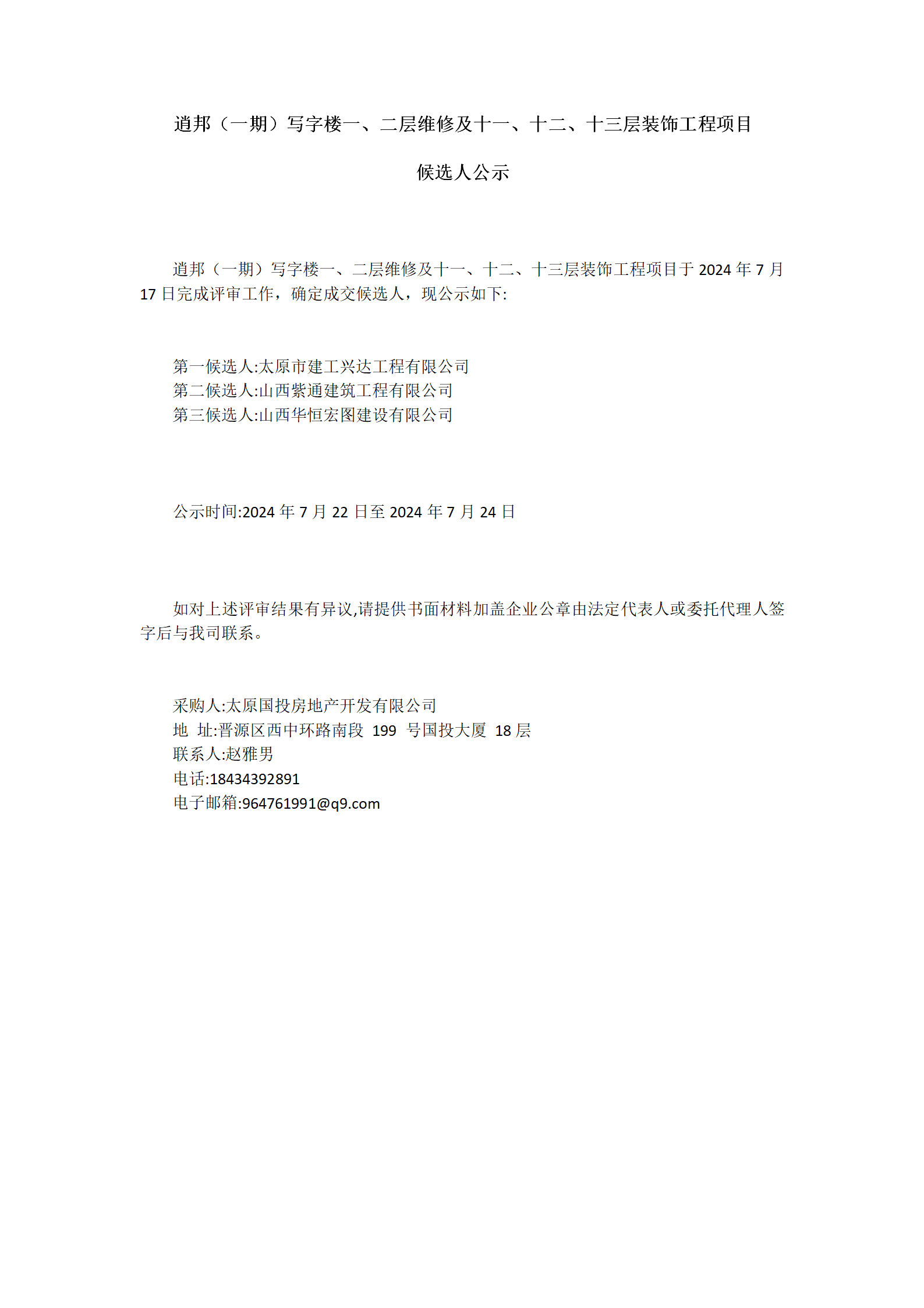逍邦(一期)寫字樓一、二層維修及十一、十二、十三層裝飾工程項目候選人公示