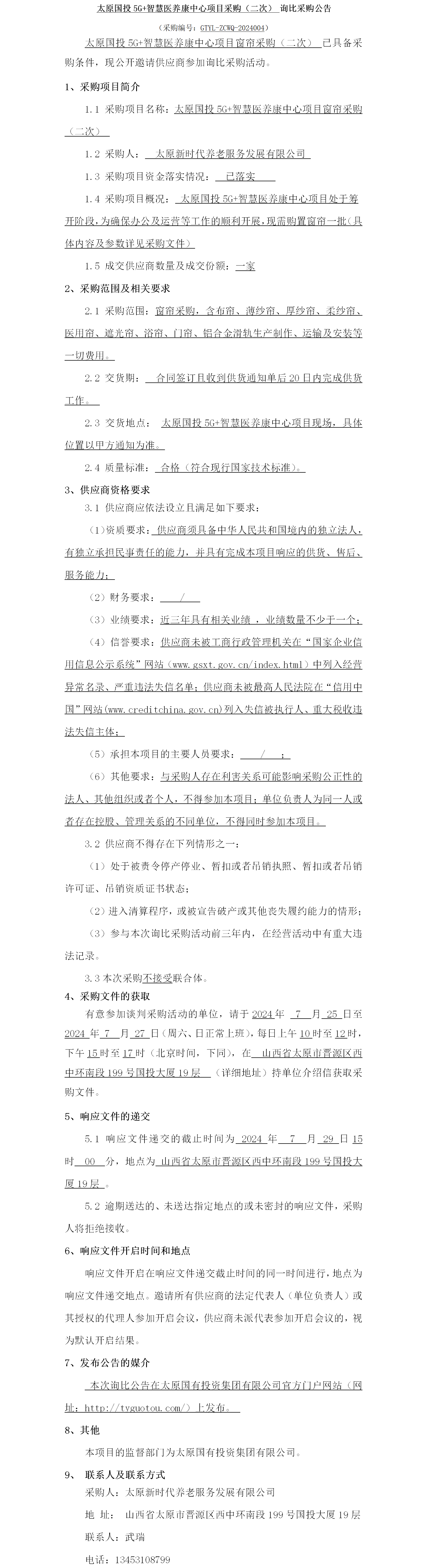 太原國投5G+智慧醫(yī)養(yǎng)康中心項目采購(二次)詢比采購公告