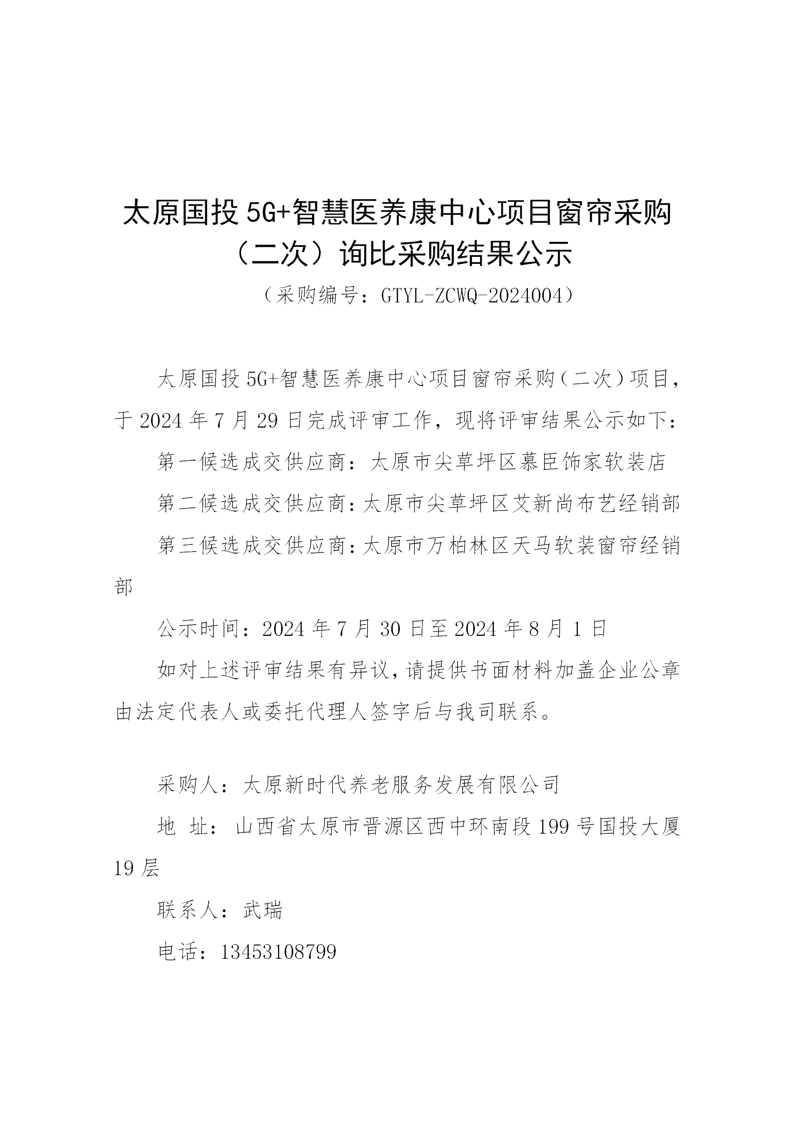 太原國投5G+智慧醫(yī)養(yǎng)康中心項目窗簾采購(二次)詢比采購結果公示