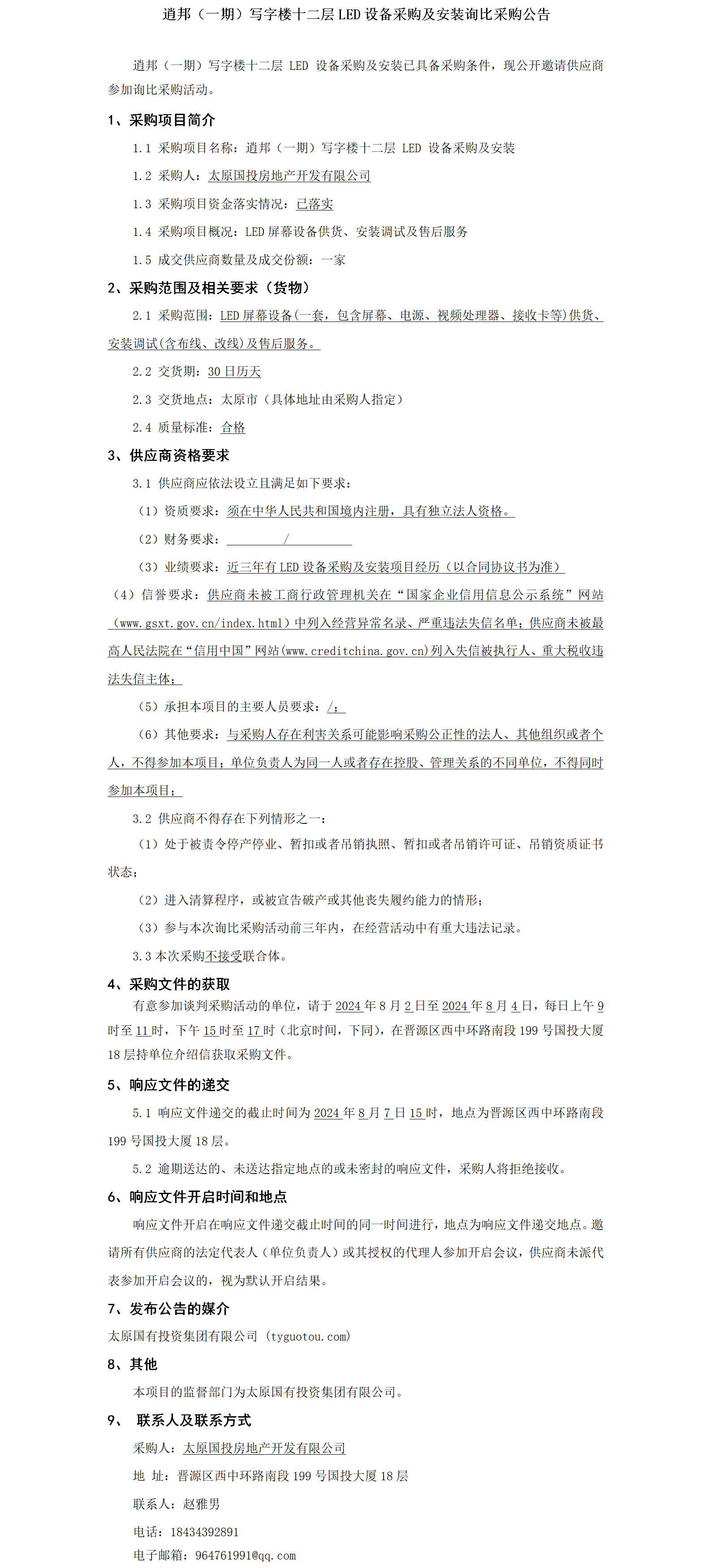 逍邦(一期)寫字樓十二層LED設備采購及安裝詢比采購公告
